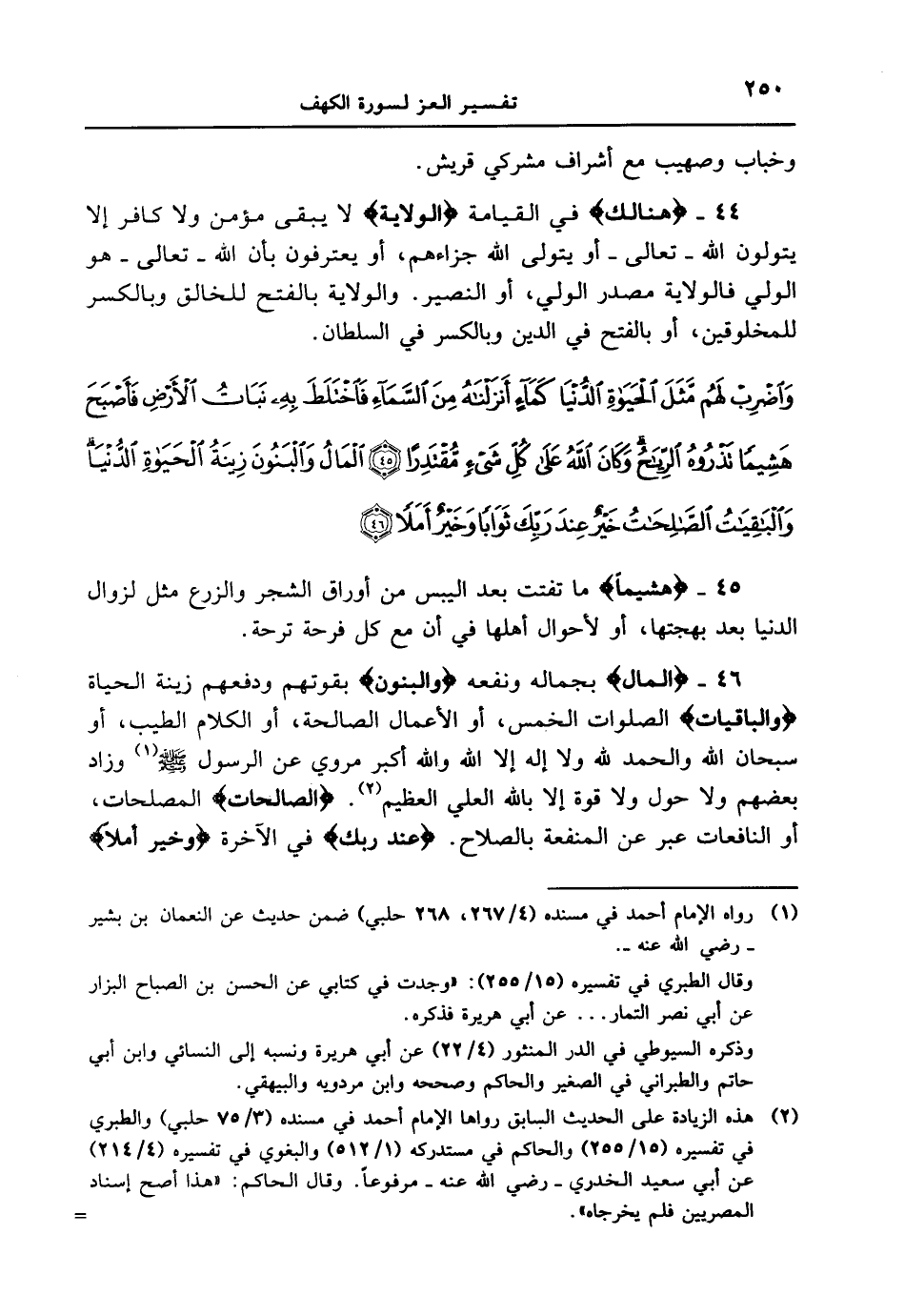 46 - {الْمَالُ} بجماله ونفعه {وَالْبَنُونَ} بقوتهم ودفعهم زينة الحياة {والباقيات} الصلوات الخمس، أو الأعمال الصالحة، أوالكلام الطيب، أو سبحان الله والحمد لله ولا إله إلا الله والله أكبر مروي عن الرسول [صلى الله عليه وسلم] وزاد بعضهم ولا حول ولا قوة إلا بالله العلي العظيم. {الصالحات} المصلحات، أوالنافعات عبّر عن المنفعة بالصلاح. {عِندَ رَبِّكَ} في الآخرة {وَخَيْرٌ أَمَلاً}