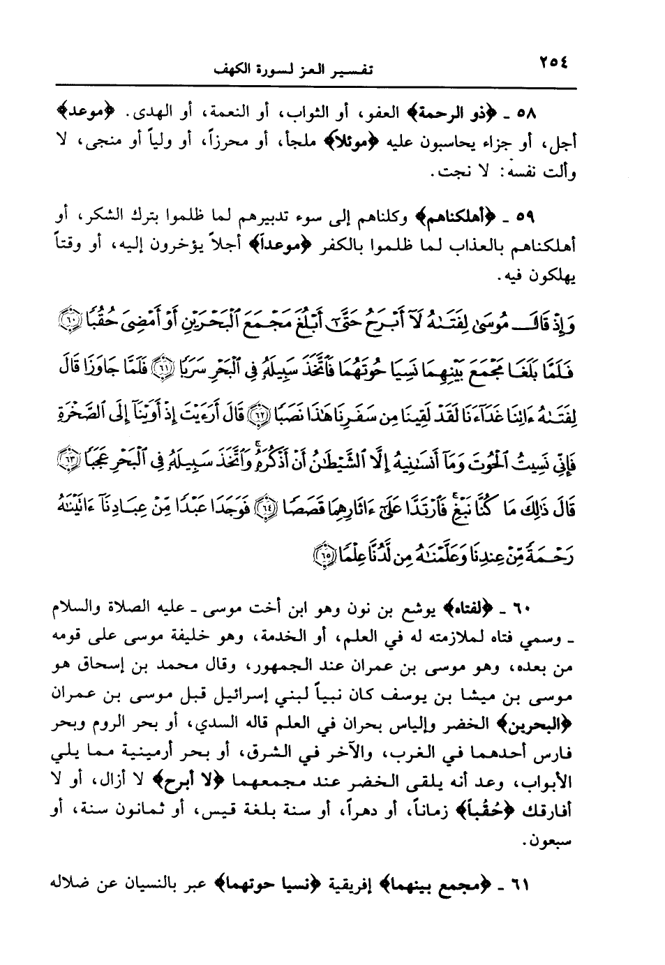 60 - {لِفَتَاهُ} يوشع بن نون وهو ابن أخت موسى - عليه الصلاة والسلام - وسمي فتاه لملازمته له في العلم، أو الخدمة، وهو خليفة موسى على قومه من بعده، وهو موسى بن عمران عند الجمهور، وقال محمد بن إسحاق هو موسى بن ميشا بن يوسف كان نبياً لبني إسرائيل قبل موسى بن عمران {الْبَحْرَيْنِ} الخضر وإلياس بحران في العلم قاله السدي، أو بحر الروم وبحر فارس أحدهما في الغرب، والآخر في الشرق، أو بحر أرمينية مما يلي الأبواب، وعد أنه يلقى الخضر عند مجمعهما {لا أَبْرَحُ} لا أزال، أو لا أفارقك {حُقُباً} زماناً، أو دهراً، أو سنة بلغة قيس، أو ثمانون سنة، أو سبعون.