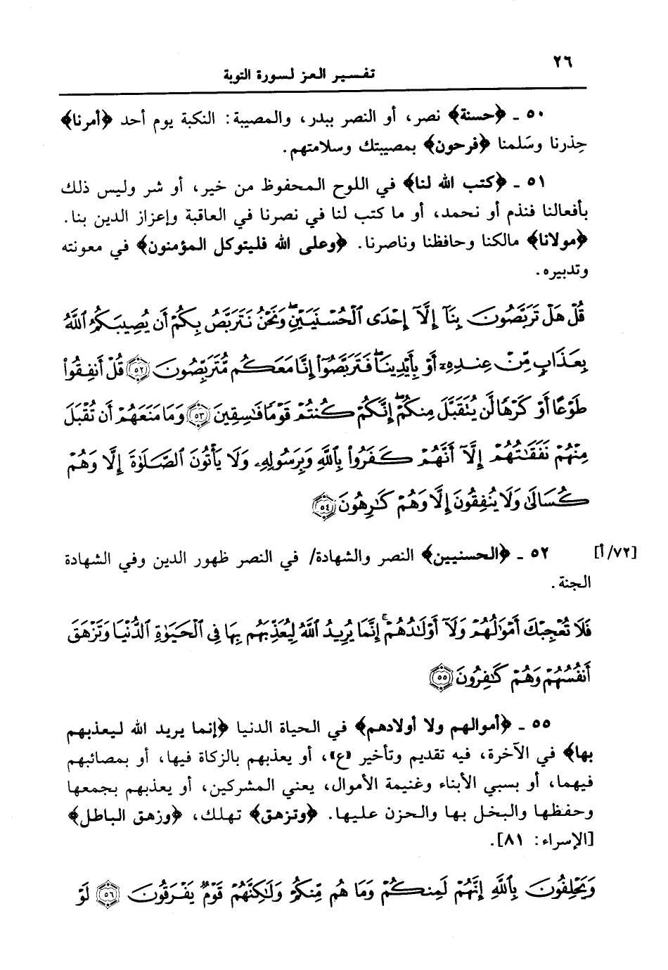 51 - {كَتَبَ اللَّهُ لَنَا} في اللوح المحفوظ من خير، أو شر وليس ذلك بأفعالنا فنذم أونحمد، أو ما كتب لنا في نصرنا في العاقبة وإعزاز الدين بنا. {مَوْلانَا} مالكنا وحافظنا وناصرنا. {وَعَلَى اللهِ فَلْيَتَوَكَّلِ الْمُؤْمِنُونَ} في معونته وتدبيره. {قل هل تربصون بنا إلا إحدى الحسنيين ونحن نتربص بكم أن يصيبكم الله بعذاب من عنده أو بأيدينا فتربصوا إنا معكم متربصون قل أنفقوا طوعا أو كرها لن يتقبل منكم إنكم كنتم قوما فاسقين وما منعهم أن تقبل منهم نفقاتهم إلا أنهم كفروا بالله وبرسوله ولا يأتون الصلاة إلا وهم كسالى ولا ينفقون إلا وهم كارهون} [72 / أ]