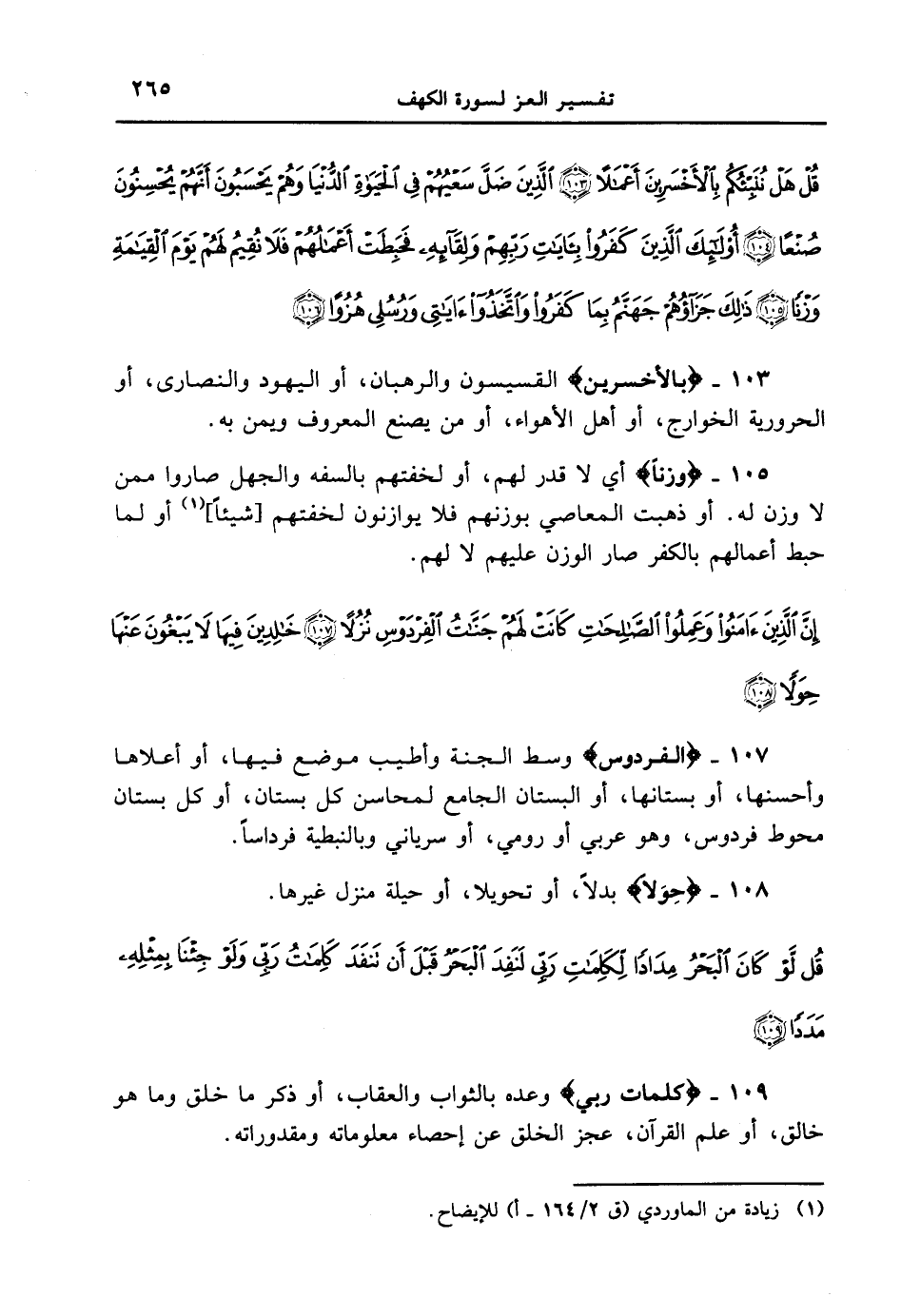 105 - {وَزْناً} أي لا قدر لهم، أو لخفتهم بالسفه والجهل صاروا ممن لا وزن له. أو ذهبت المعاصي بوزنهم فلا يوازنون لخفتهم [شيئاً] أو لما حبط أعمالهم بالكفر صار الوزن عليهم لا لهم. {إن الذين ءامنوا وعملوا الصالحات كانت لهم جنات الفردوس نزلاً خالدين فيها لا يبغون عنها حولاً}