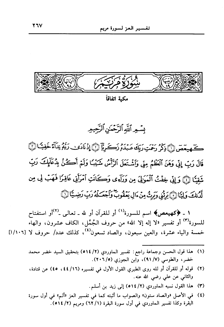 1 - كهيعص} اسم للسورة أو للقرآن أو لله - تعالى - أو استفتاح للسورة أو تفسير " لا إله إلا الله " من حروف الجُمَّل، الكاف عشرون، والهاء خمسة والياء عشرة، والعين سبعون، والصاد تسعون، كذلك عدد / حروف لا