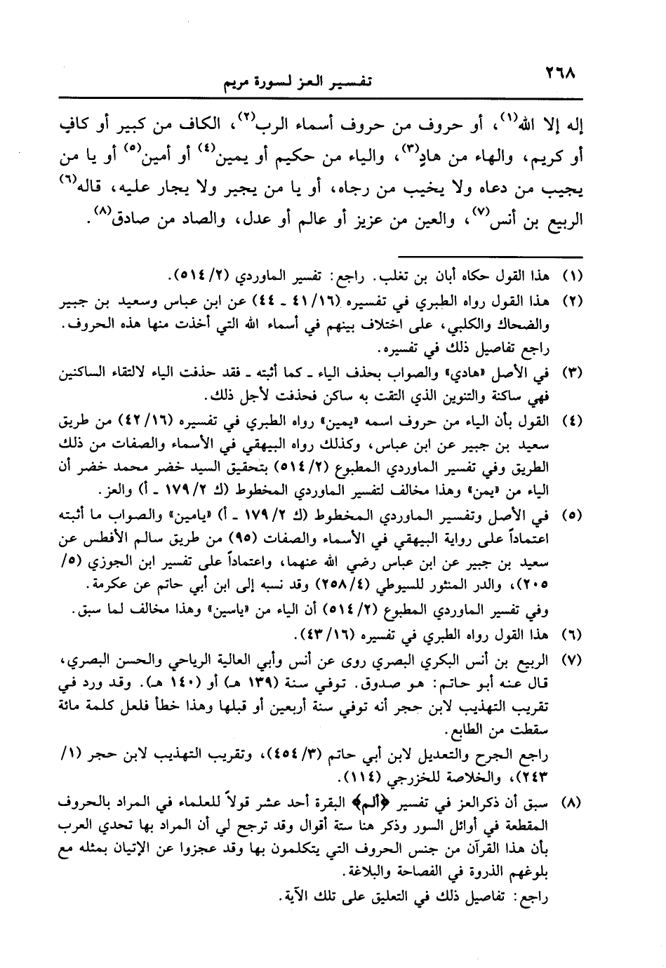 إله إلا الله، أو حروف من حروف أسماء الرب، الكاف من كبير أو كافٍ أو كريم، والهاء من هادٍ، والياء من حكيم أو يمين أو أمين أو يا من يجيب من دعاه ولا يخيب من رجاه، أو يا من يجير ولا يجار عليه، قاله الربيع بن أنس، والعين من عزيز أو عالم أو عدل، والصاد من صادق.