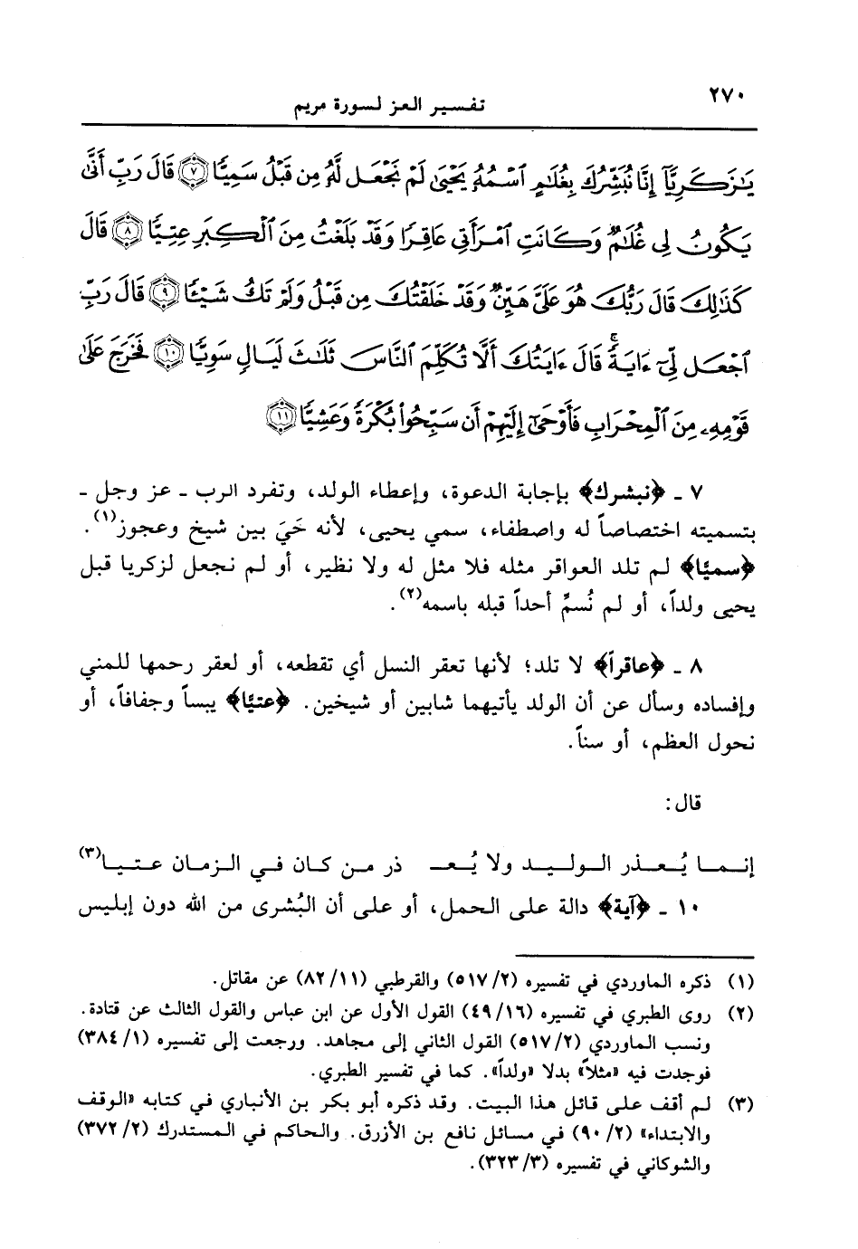 8 - {عَاقِراً} لا تلد؛ لأنها تعقر النسل أي تقطعه، أو لعقر رحمها للمني وإفساده وسأل عن أن الولد يأتيهما شابين أو شيخين. {عتيا} يبساً وجفافاً، أو نحول العظم، أو سناً. قال: