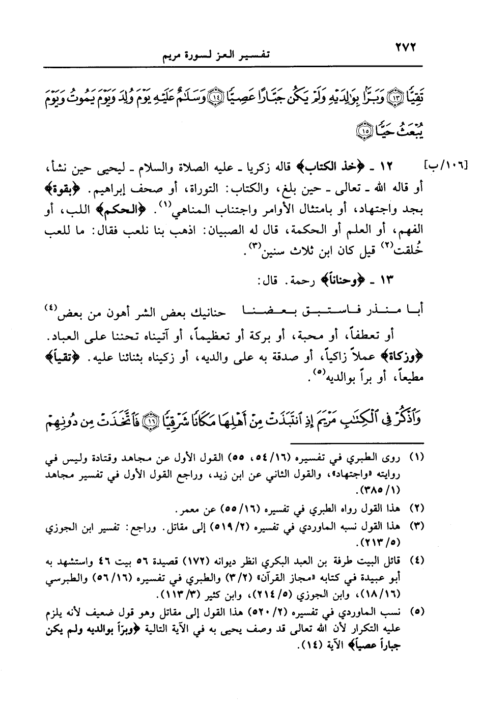 12 - {خذ الكتاب} قاله زكريا - عليه الصلاة والسلام - ليحيى حين نشأ، أو قاله الله - تعالى - حين بلغ، والكتاب: التوراة، أو صحف إبراهيم. {بقوة} بجد واجتهاد، أو بامتثال الأوامر واجتناب المناهي. {الْحُكْمَ} اللب، أو الفهم، أو العلم أو الحكمة، قال له الصبيان: اذهب بنا نلعب فقال: ما للعب خُلقت قيل كان ابن ثلاث سنين.