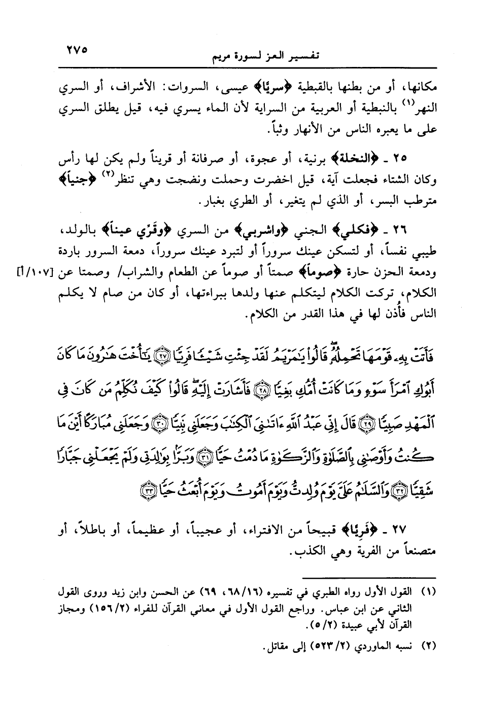 26 - {فَكُلِى} الجني {وَاشْرَبِى} من السري {وَقَرِّى عَيْناً} بالولد، طيبي نفساً، أو لتسكن عينك سروراً أو لتبرد عينك سروراً، دمعة السرور باردة ودمعة الحزن حارة {صَوْماً} صمتاً أو صوماً عن الطعام والشراب / [107 / أ] وصمتاً عن الكلام، تركت الكلام ليتكلم عنها ولدها ببرءاتها، أو كان من صام لا يكلم الناس فأُذن لها في هذا القدر من الكلام. {فأتت به قومها تحمله قالوا يامريم لقد جئت شيئاً فريّا يا أخت هارون ما كان أبوك امرأ سوءٍ وما كانت أمك بغياً فأشارت إليه قالوا كيف نكلّم من كان في المهد صبياً قال إني عبد الله ءاتاني الكتاب وجعلني نبيّا وجعلني مباركاً أين ما كنت وأوصاني بالصلاة والزكاة ما دمت حيّا وبرّا بوالدتي ولم يجعلني جبّاراً شقياً والسلام عليّ يوم ولدت ويوم أموت ويوم أبعث حيا}