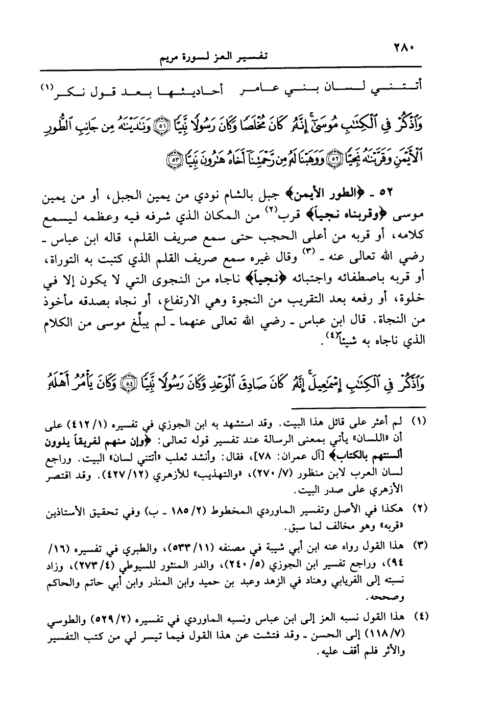 52 - {الطُّورِ الأَيْمَنِ} جبل بالشام نودي من يمين الجبل، أو من يمين موسى {وَقَرِّبْنَاهُ نَجِيّاً} قرب من المكان الذي شرفه فيه وعظمه ليسمع كلامه، أو قربه من أعلى الحجب حتى سمع صريف القلم، قاله ابن عباس - رضي الله تعالى عنه - وقال غيره سمع صريف القلم الذي كتبت به التوراة، أو قربه باصطفائه واجتبائه {نَجِيّاً} ناجاه من النجوى التي لا يكون إلا في خلوة، أو رفعه بعد التقريب من النجوة وهي الارتفاع، أو نجاه بصدقه مأخوذ من النجاة. قال ابن عباس - رضي الله تعالى عنهما - لم يبلِّغ موسى من الكلام الذي ناجاه به شيئاً. {واذكر في الكتاب إسماعيل إنّه كان صادق الوعد وكان رسولاً نبيّاً وكان يأمر أهله