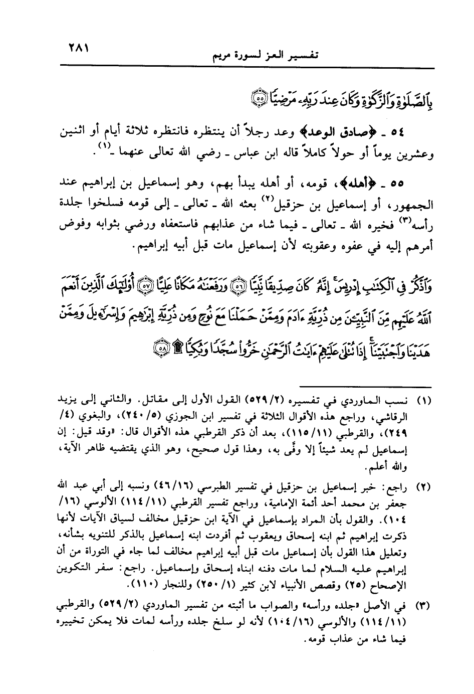 54 - {صَادِقَ الْوَعْدِ} وعد رجلاً أن ينتظره فانتظره ثلاثة أيام أو اثنين وعشرين يوماً أو حولاً كاملاً قاله ابن عباس - رضي الله تعالى عنهما -. \ 55 - {أَهْلَهُ} ، قومه، أو أهله يبدأ بهم، وهو إسماعيل بن إبراهيم عند الجمهور، أو إسماعيل بن حزقيل بعثه الله - تعالى - إلى قومه فسلخوا جلدة رأسه فخيره الله - تعالى - فيما شاء من عذابهم فاستعفاه ورضي بثوابه وفوض أمرهم إليه في عفوه وعقوبته لأن إسماعيل مات قبل أبيه إبراهيم. {واذكر في الكتاب إدريس إنّه كان صدّيقاً نبّيّاً ورفعناه مكاناً عليّاً أولئك الذين أنعم الله عليهم من النبين من ذرية ءادم وممّن حملنا مع نوحٍ ومن ذرية إبراهيم وإسرائيل وممّن هدينا واجتبينا إذا تتلى عليهم ءايات الرحمن خرّوا سجّداً وبكياً}