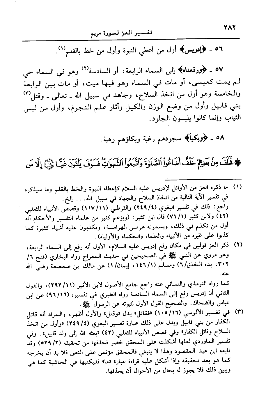 57 - {وَرَفَعْنَاهُ} إلى السماء الرابعة، أو السادسة وهو في السماء حي لم يمت كعيسى، أو مات في السماء وهو فيها ميت، أو مات بين الرابعة والخامسة وهو أول من اتخذ السلاح، وجاهد في سبيل الله - تعالى - وقتل بني قابيل وأول من وضع الوزن والكيل وأثار علم النجوم، وأول من لبس الثياب وإنما كانوا يلبسون الجلود.