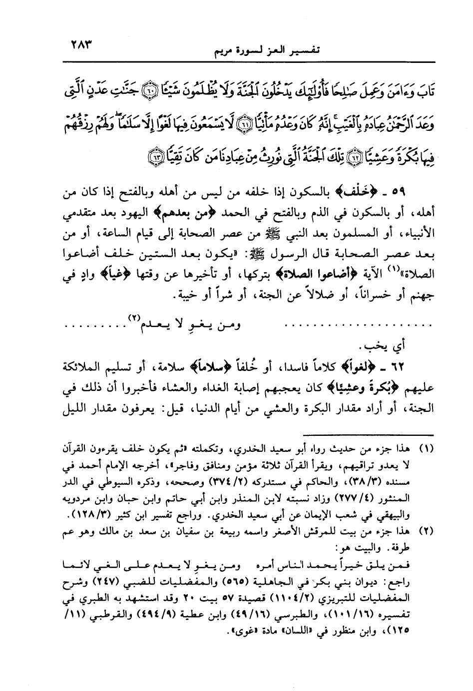 62 - {لَغْواً} كلاماً فاسداً، أو خُلفاً {سَلاماً} سلامة، أو تسليم الملائكة عليهم {بُكْرَةً وَعَشِيّاً} كان يعجبهم إصابة الغداء والعشاء فأُخبروا أن ذلك في الجنة، أو أراد مقدار البكرة والعشي من أيام الدنيا، قيل: يعرفون مقدار الليل