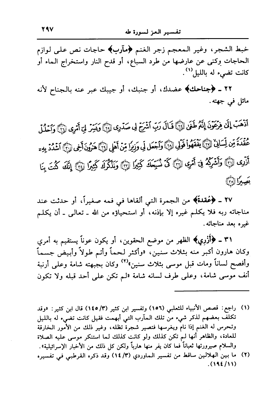 22 - {جَنَاحِكَ} عضدك، أو جنبك، أو جيبك عبّر عنه بالجناح لأنه مائل في جهته. {اذهب إلى فرعون إنّه طغى قال ربّ اشرح لي صدرك ويسر لي أمري واحلل عقدة من لساني يفقهوا قولي واجعل لي وزيراً من أهلي هارون أخي أشدد به أزرى وأشركه في أمري كي نسبحك كثيراً ونذكرك كثيراً إنك كنت بنا بصيراً}