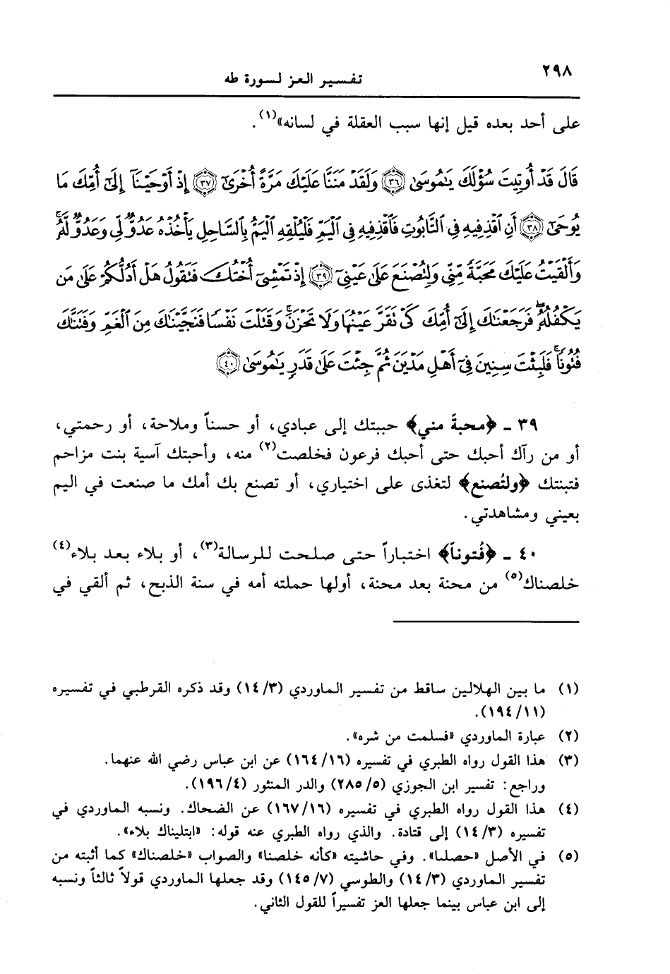 39 - {مَحَبَّةً مِّنِّى} حببتك إلى عبادي، أو حسناً وملاحة، أو رحمتي، أو من رآك حتى أحبك فرعون فخلصت منه، وأحبتك آسية بنت مزاحم فتبنتك {وَلِتُصْنَعَ} لتغذى على اختياري، أو تصنع بك أمك ما صنعت في اليم بعيني ومشاهدتي.