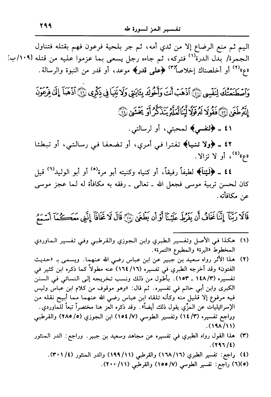 44 - {لَّيِّناً} لطيفاً رفيقاً، أو كنياه وكنيته أبو مرة أو أبو الوليد قيل كان لحسن تربية موسى فجعل الله - تعالى - رفقه به مكافأة له لما عجز موسى عن مكافأته. {قالا ربّنا إنّنا نخاف أن يفرط علينا أو أن يطغى قال لا تخافا إنني معكما أسمع