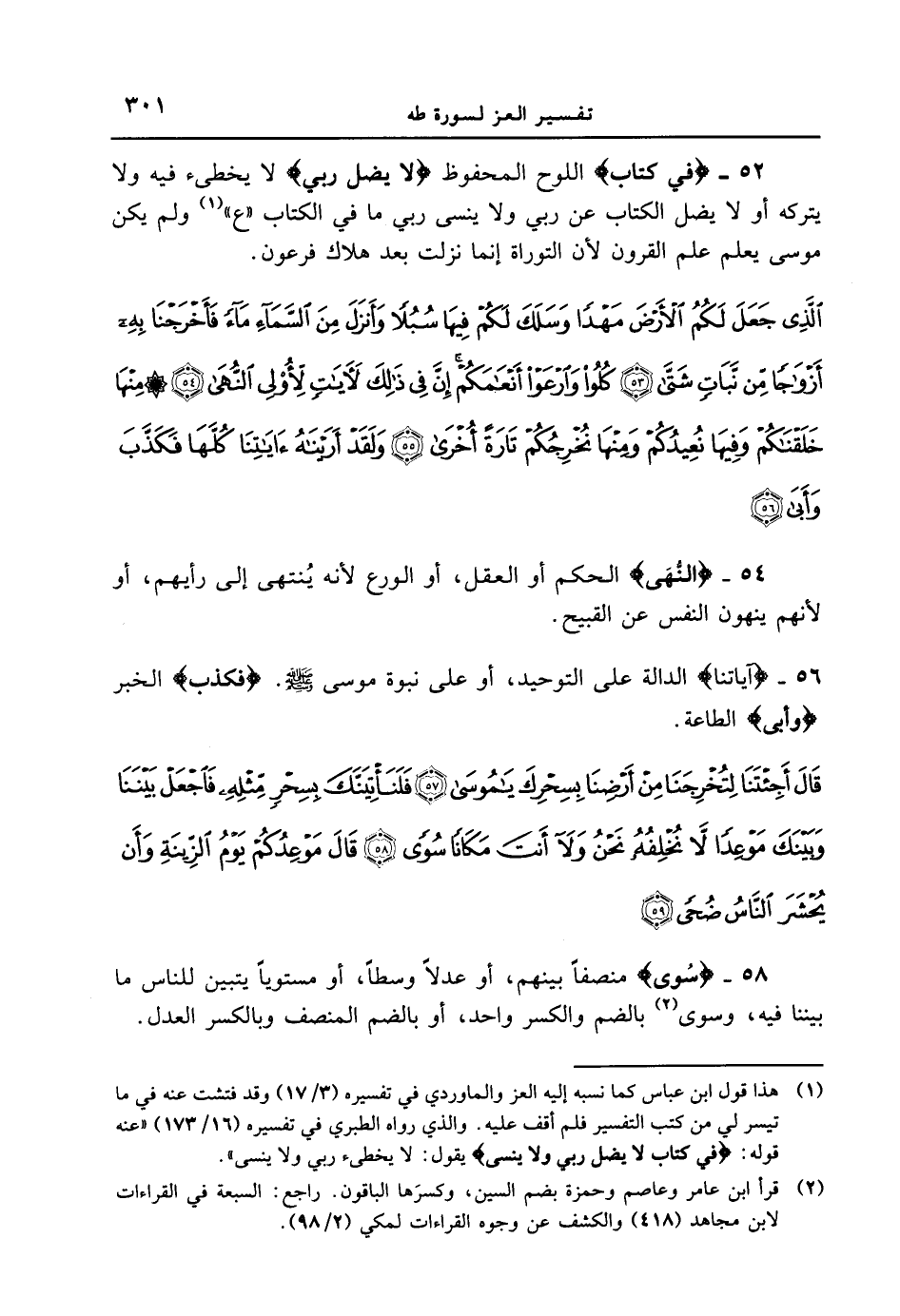 52 - {في كتاب} اللوح الحفوظ {لا يضل ربي} لا يخطئ فيه ولا يتركه أو لا يضل الكتاب عن ربي ولا ينسى ربي ما في الكتاب " ع " ولم يكن موسى يعلم علم القرون لأن التوراة إنما نزلت بعد هلاك فرعون. {الذي جعل لكم الأرض مهداً وسلك لكم فيها سبلاً وأنزل من السماء ماءً فأخرجنا به أزوجاً من نباتٍ شتى كلوا وارعوا أنعامكم إنّ في ذلك لآياتٍ لأولى النهى منها خلقناكم وفيها نعيدكم ومنها نخرجكم تارة أخرى ولقد أريناه ءاياتنا كلهّا فكذّب وأبى}