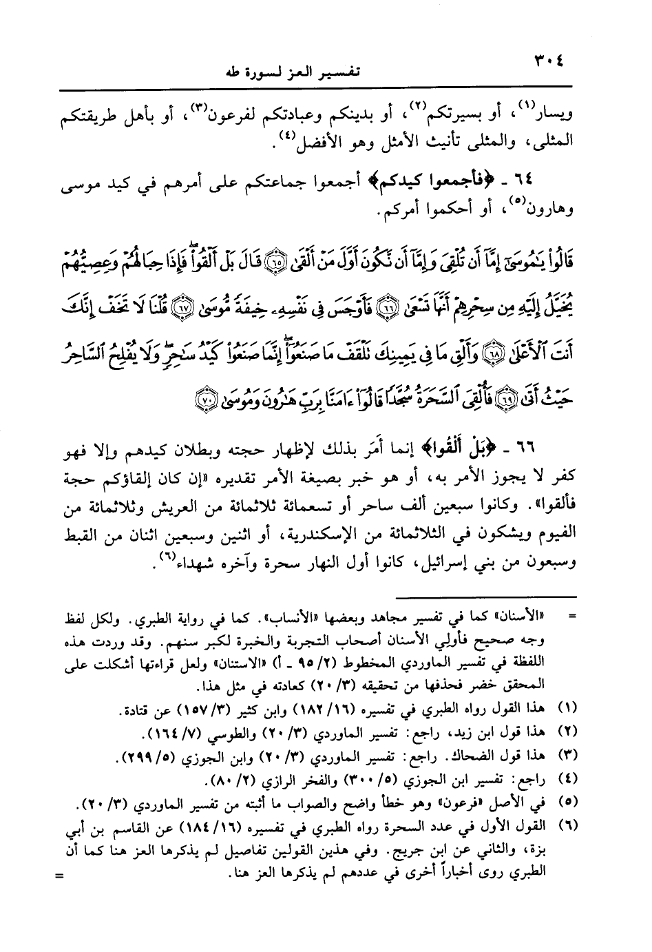 66 - {بَلْ أَلْقُواْ} إنما أمر بذلك لإظهار حجته وبطلان كيدهم وإلا فهو كفر لا يجوز الأمر به، أو هو خبر بصيغة الأمر تقديره " إن كان إلقاؤكم حجة فألقوا ". وكانوا سبعين ألف ساحر أو تسعمائة ثلاثمائة من العريش وثلاثمائة من الفيوم ويشكون في الثلاثمائة من الإسكندرية، أو اثنين وسبعين اثنان من القبط وسبعون من بني إسرائيل، كانوا أول النهار سحرة وآخره شهداء.