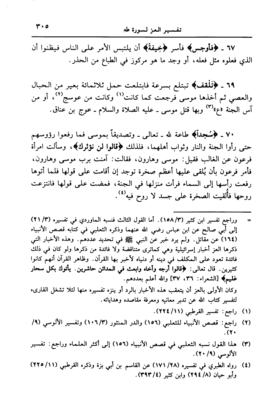 67 - {فَأَوْجَسَ} فأسر {خِيفَةً} أن يلتبس الأمر على الناس فيظنوا أن الذي فعلوه مثل فعله، أو وجد ما هو مركوز في الطباع من الحذر. 69 {تَلْقَفْ} تبتلع بسرعة فابتلعت حمل ثلاثمائة بعير من الحبال والعصي ثم أخذها موسى فرجعت كما كانت وكانت من عوسج، أو من آس الجنة " ع " وبها قتل موسى - عليه الصلاة والسلام - عوج بن عناق. 70 {سُجَّداً} طاعة لله - تعالى - وتصديقاً بموسى فما رفعوا رؤوسهم حتى رأوا الجنة والنار وثواب أهلهما، فلذلك {قَالُواْ لَن نُّؤْثِرَكَ} ، وسألت امرأة فرعون عن الغالب فقيل: موسى وهارون، فقالت: آمنت برب موسى وهارون، فأمر فرعون بأن يُلقى عليها أعظم صخرة توجد إن أقامت على قولها فلما أتوها رفعت رأسها إلى السماء فرأت منزلها في الجنة، فمضت على قولها فانتزعت روحها فأُلقيت الصخرة على جسد لا روح فيه.