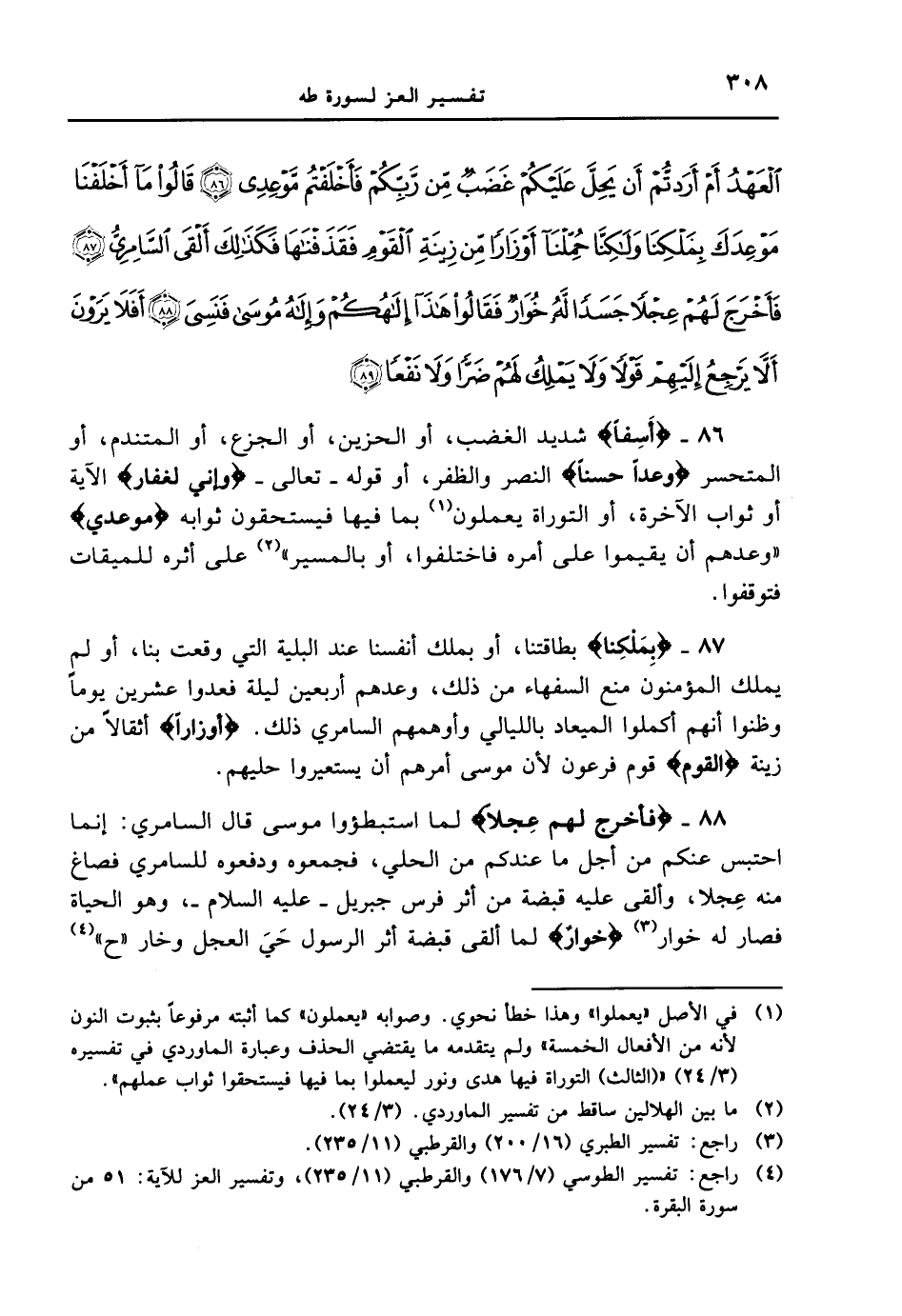 86 - {أَسِفاً} شديد الغضب، أو الحزين، أو الجزع، أو المتندم، أو المتحسر {وَعْداً حَسَناً} النصر والظفر، أو قوله - تعالى - {وَإِنِّى لَغَفَّارٌ} الآية أو ثواب الآخرة، أو التوراة يعملون بما فيها فيستحقون ثوابه {مَّوْعِدِى} " وعدهم أن يقيموا على أمره فاختلفوا، أو بالمسير " على أثره للميقات فتوقفوا.