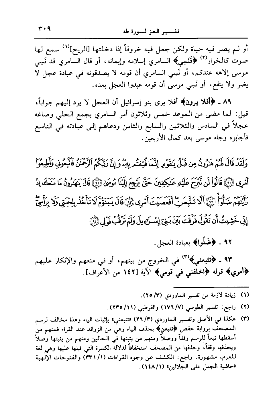 89 - {أَفَلا يَرَوْنَ} أفلا يرى بنو إسرائيل أن العجل لا يرد إليهم جواباً، قيل: لما مضى من الموعد خمس وثلاثون أمر السامري بجمع الحلي وصاغه عجلاً في السادس والثلاثين والسابع والثامن ودعاهم إلى عبادته في التاسع فأجابوه وجاء موسى بعد كمال الأربعين. {ولقد قال لهم هارون من قبل يا قوم إنّما فتنتم به وإنّ ربّكم الرحمن فاتّبعوني وأطيعوا أمرى قالوا لن نبرح عليه عاكفين حتى يرجع إلينا موسى قال يا هارون ما منعك إذ رأيتهم ضلوا ألا تتبّعن أفعصيت أمري قال يبنؤم لا تأخذ بلحيتي ولا برأسي إني خشيت أن تقول فرّقت بين بنى إسرائيل ولم ترقب قولي}