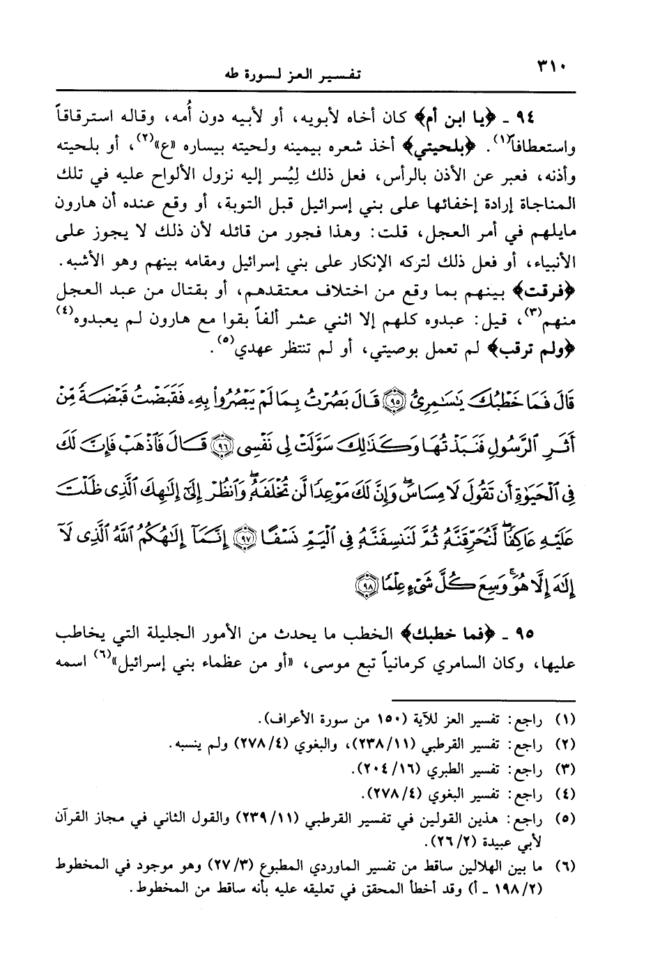 94 - {يا ابن أم} كان أخاه لأبويه، أو لأبيه دون أُمه، وقاله اسرقاقاً واستعطافاً. {بِلِحْيَتِى} أخذ شعره بيمينه ولحيته بيساره " ع "، أو بلحيته وأذنه، فعبّر عن الأذن بالرأس، فعل ذلك لِيُسر إليه نزول الألواح عليه في تلك المناجاة إرادة إخفائها على بني إسرائيل قبل التوبة، أو وقع عنده أن هارون مايلهم في أمر العجل، قلت: وهذا فجور من قائله لأن ذلك لا يجوز على الأنبياء، أو فعل ذلك لتركه الإنكار على بني إسرائيل ومقامه بينهم وهو الأشبه. {فَرَّقْتَ} بينهم بما وقع من اختلاف معتقدهم، أو بقتال من عبد العجل منهم، قيل: عبدوه كلهم إلا اثني عشر ألفاً بقوا مع هارون لم يعبدوه {وَلَمْ تَرْقُبْ} لم تعمل بوصيتي، أو لم تنتظر عهدي. {قال فما خطبك يا سامري قال بصرت بما لم يبصروا به فقبضت قبضةً من أثرالرسول فنبذتها وكذلك سوّلت لي نفسي قال فاذهب فإن لك في الحياة أن تقول لا مساس وإن لك موعداً لن تخلفه وانظر إلى إلهك الذي ظلت عليه عاكفاً لنحرقنّه ثم لننسفنّه في اليمّ نسفاً 97 إنما إلهكم الله الذي لا إله إلا هو وسع كل شىءٍ علماً}