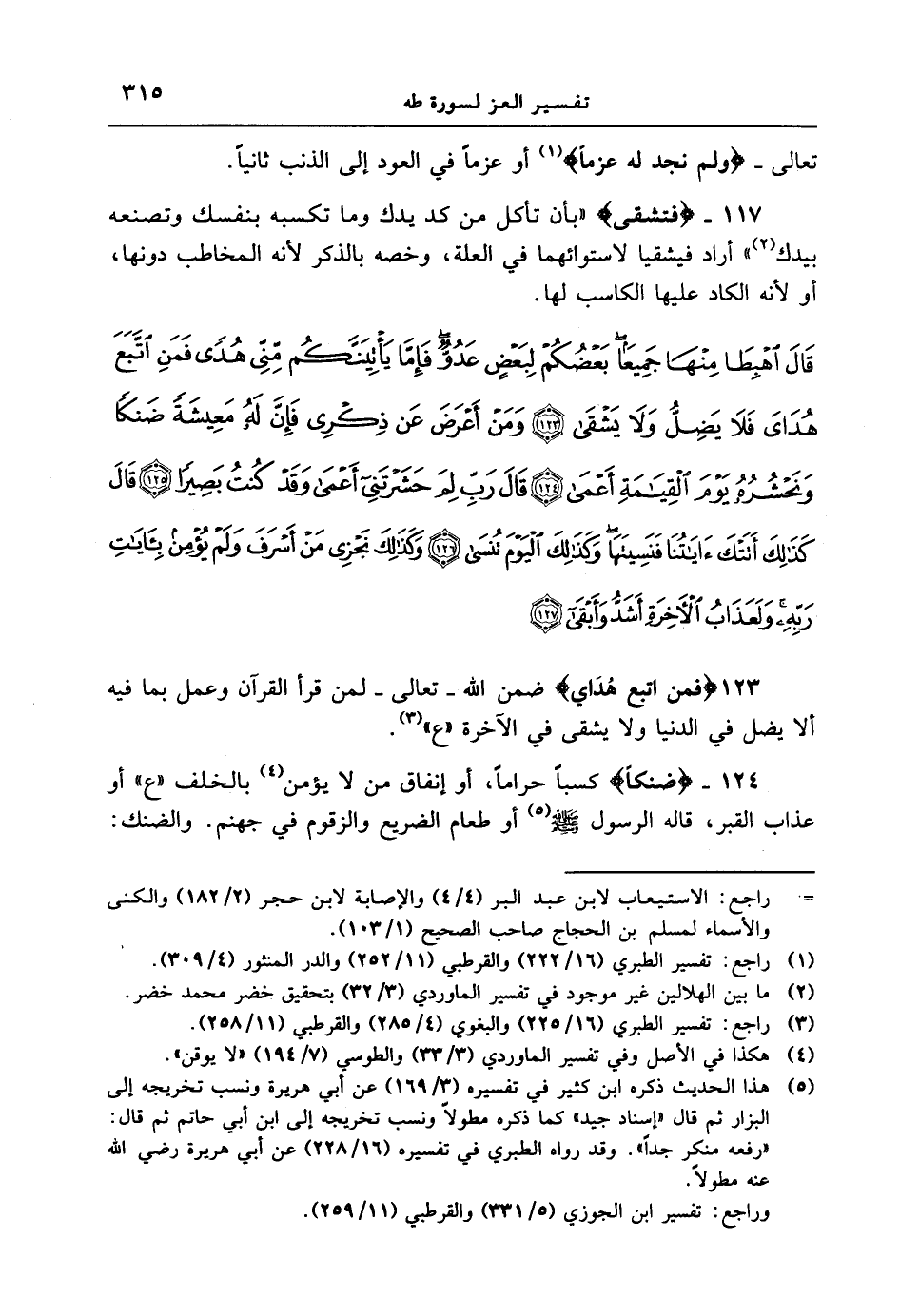 117 - {فَتَشْقَى} " بأن تأكل من كد يدك وما تكسبه بنفسك وتصنعه بيدك " أراد فيشقيا لاستوائهما في العلة، وخصه بالذكر لأنه المخاطب دونها، أو لأنه الكاد عليها الكاسب لها. {قال اهبطا منها جميعاً بعضكم لبعضٍ عدو فإما يأتينّكم منّى هدى فمن اتّبع هداي فلا يضل ولا يشقى 123 ومن أعرض عن ذكرى فإن له معيشة ضنكاً ونحشره يوم القيامة أعمى قال ربّ لم حشرتني أعمى وقد كنت بصيراً قال كذلك أتتك ءاياتنا فنسيتها وكذلك اليوم تنسى وكذلك نجزى من أسرف ولم يؤمن بئايات ربه ولعذاب الآخرة أشد وأبقى}