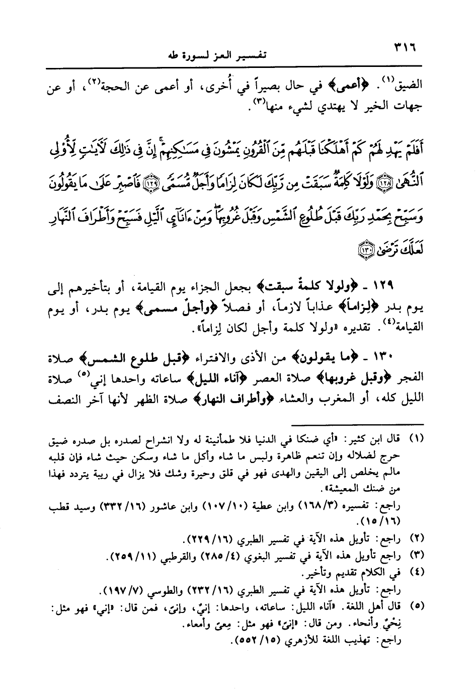 الضيق. {أعمى} في حال بصيراً في أخرى، أو أعمى عن الحجة، أوعن جهات الخير لا يهتدي لشيء منها. {أفلم يهد لهم كم أهلكنا قبلهم من القرون يمشون في مساكنهم إن في ذلك لآيات لأولي النهى ولولا كلمةٌ سبقت من ربك لكان لزاماً وأجلٌ مسمى فاصبر على ما يقولون وسبّح بحمد ربك قبل طلوع الشمس وقبل غروبها ومن ءانائ الّيل فسبّح وأطراف النهار لعلك ترضى}