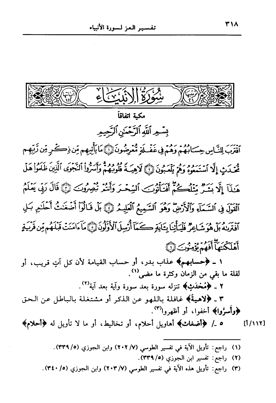 {اقترب للناس حسابهم وهم في غفلة معرضون ما يأتيهم من ذكرٍ من ربّهم محدثٍ إلا استمعوه وهم يلعبون لاهيةً قلوبهم وأسرّوا النّجوى الذين ظلموا هل هذا إلا بشرٌ مثلكم أفتأتون السحر وأنتم تبصرون قال ربي يعلم القول في السماء والأرض وهو السميع العليم بل قالوا أضغاث أحلام بل افتراه بل هو شاعر فليأتنا بئايةٍ كما أرسل الأوّلون ما ءامنت قبلهم من قريةٍ أهلكناها أفهم يؤمنون}