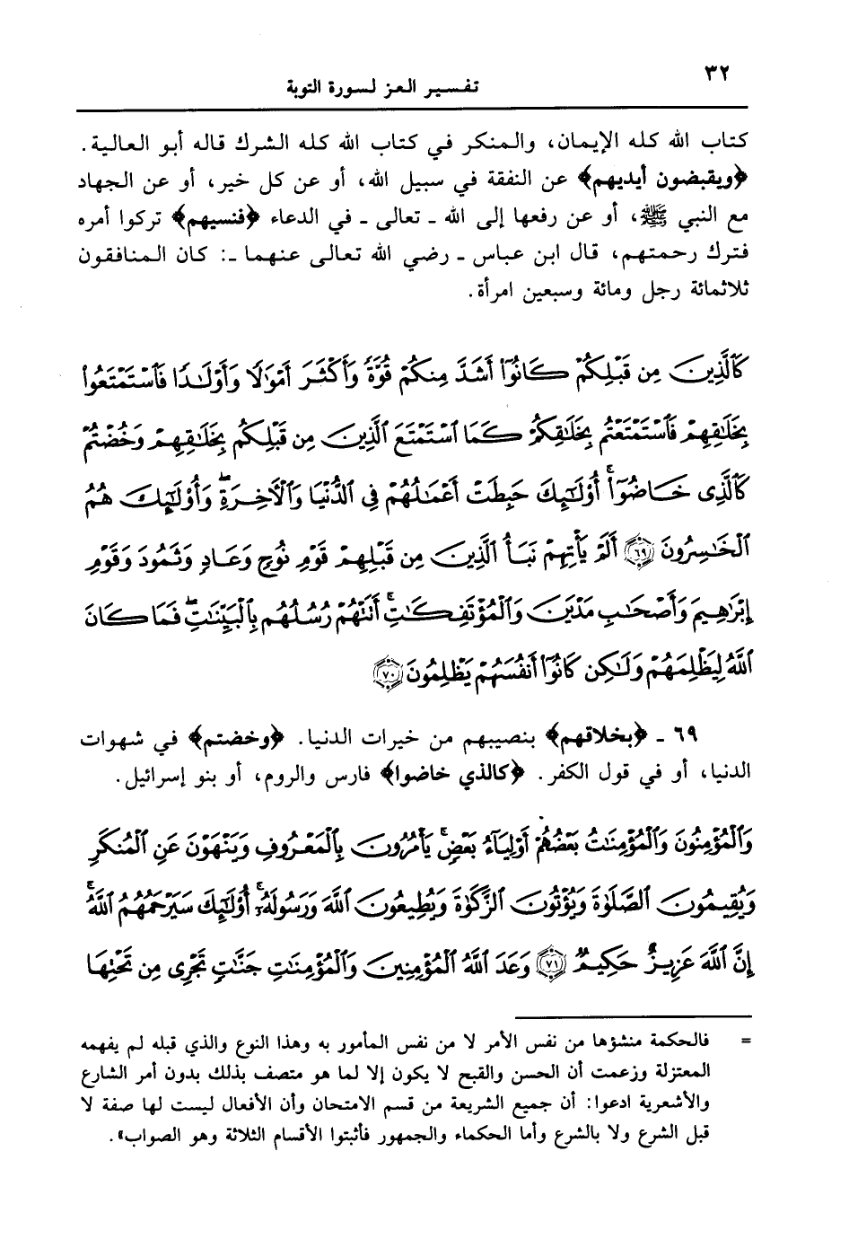69 - {بِخَلاقِهِمْ} بنصيبهم من خيرات الدنيا. {وَخُضْتُمْ} في شهوات الدنيا، أو في قول الكفر. {كَالَّذِى خاضوا} فارس والروم، أو بنو إسرائيل. {والمؤمنون والمؤمنات بعضهم أولياء بعضٍ يأمرون بالمعروف وينهون عن المنكر ويقيمون الصلاة ويؤتون الزكاة ويطيعون الله ورسوله أولئك سيرحمهم الله إن الله عزيز حكيم وعد الله المؤمنين والمؤمنات جنات تجري من تحتها