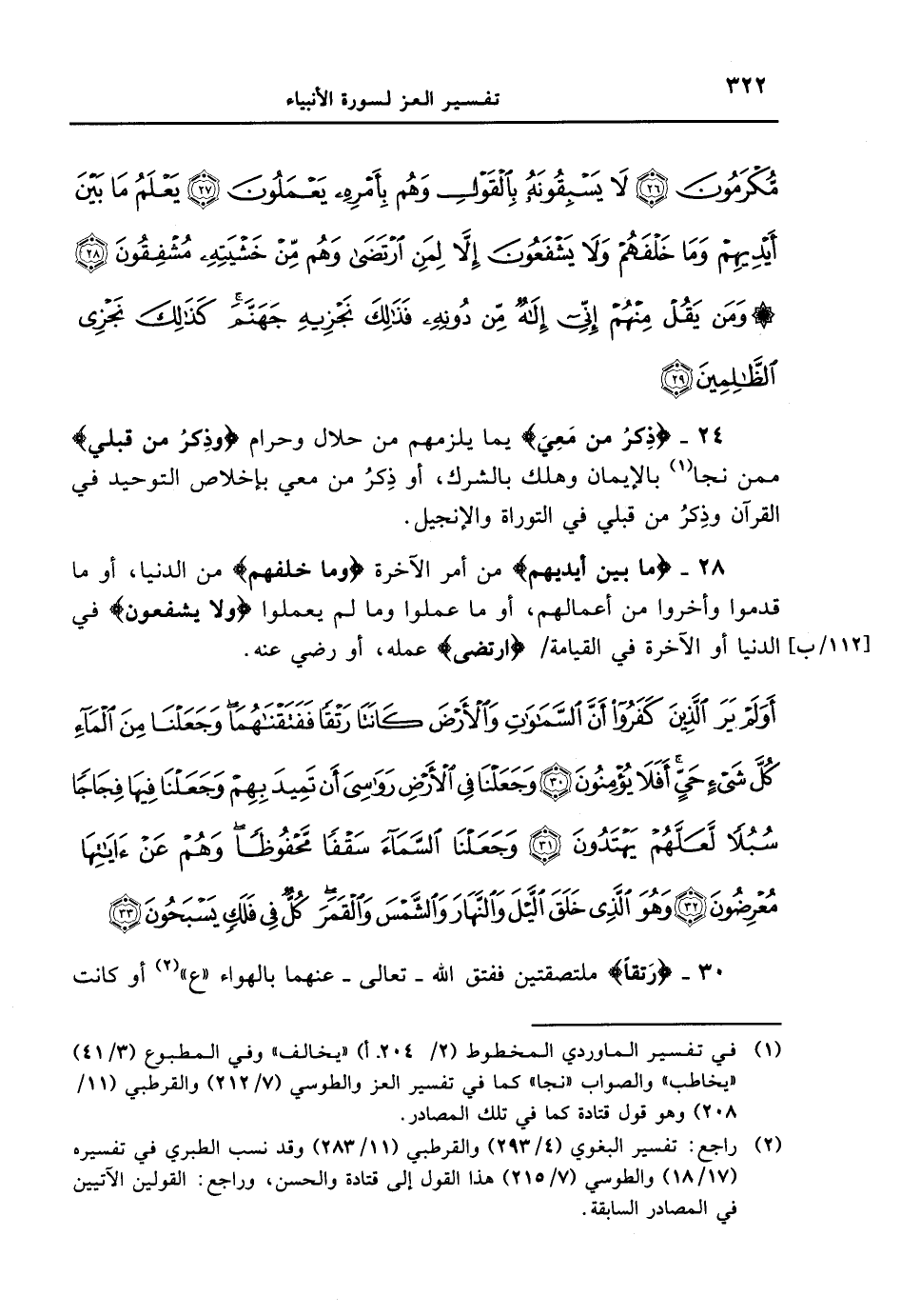 28 - {مَا بَيْنَ أَيْدِيهِمْ} من أمر الآخرة {وَمَا خَلْفَهُمْ} من الدنيا، أو ما قدموا وأخروا من أعمالهم، أو ما عملوا وما لم يعملوا {وَلا يَشْفَعُونَ} في الدنيا أو الآخرة في القيامة / [112 / ب] {ارتضى} عمله، أو رضي عنه. {أو لم ير الذين كفروا أن السموات والأرض كانتا رتقاً ففتقناهما وجعلنا من الماء كل شىءٍ حيٍ أفلا يؤمنون وجعلنا في الأرض رواسي أن تميد بهم وجعلنا فيها فجاجاً سبلاً لعلّهم يهتدون وجعلنا السماء سقفاً محفوظاً وهم عن ءاياتها معرضون وهوالذي خلق الّيل والنهار والشمس والقمر كلٌّ في فلكٍ يسبحون} \ 30 - {رَتْقاً} ملتصقتين ففتق الله - تعالى - عنهما بالهواء " ع " أو كانت