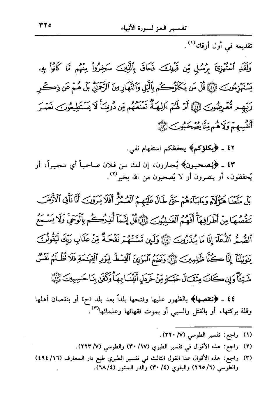 44 - {نَنقُصُهَا} بالظهور عليها وفتحها بلداً بعد بلد " ح " أو بنقصان أهلها وقلة بركتها، أو بالقتل والسبي أو بموت فقهائها وعلمائها.