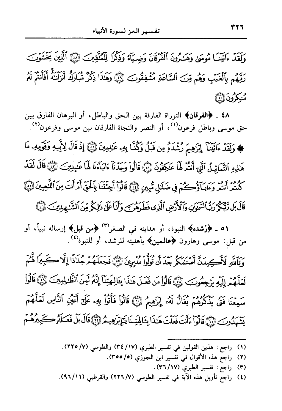 48 - {الْفُرْقَانَ} التوراة الفارقة بين الحق والباطل، أو البرهان الفارق بين حق موسى وباطل فرعون، أو النصر والنجاة الفارقان بين موسى وفرعون. {ولقد ءاتينا إبراهيم رشده من قبل وكنّا به عالمين إذ قال لأبيه وقومه ما هذه التماثيل التي أنتم لها عاكفون قالوا وجدنا ءاباءانا لها عابدين قال لقد كنتم أنتم وءباؤكم في ضلالٍ مبين قالوا أجئتنا بالحق أم أنت من اللاعبين قال بل ربّكم ربّ السموات والأرض الذي فطرهن وأنا على ذلكم من الشاهدين}
