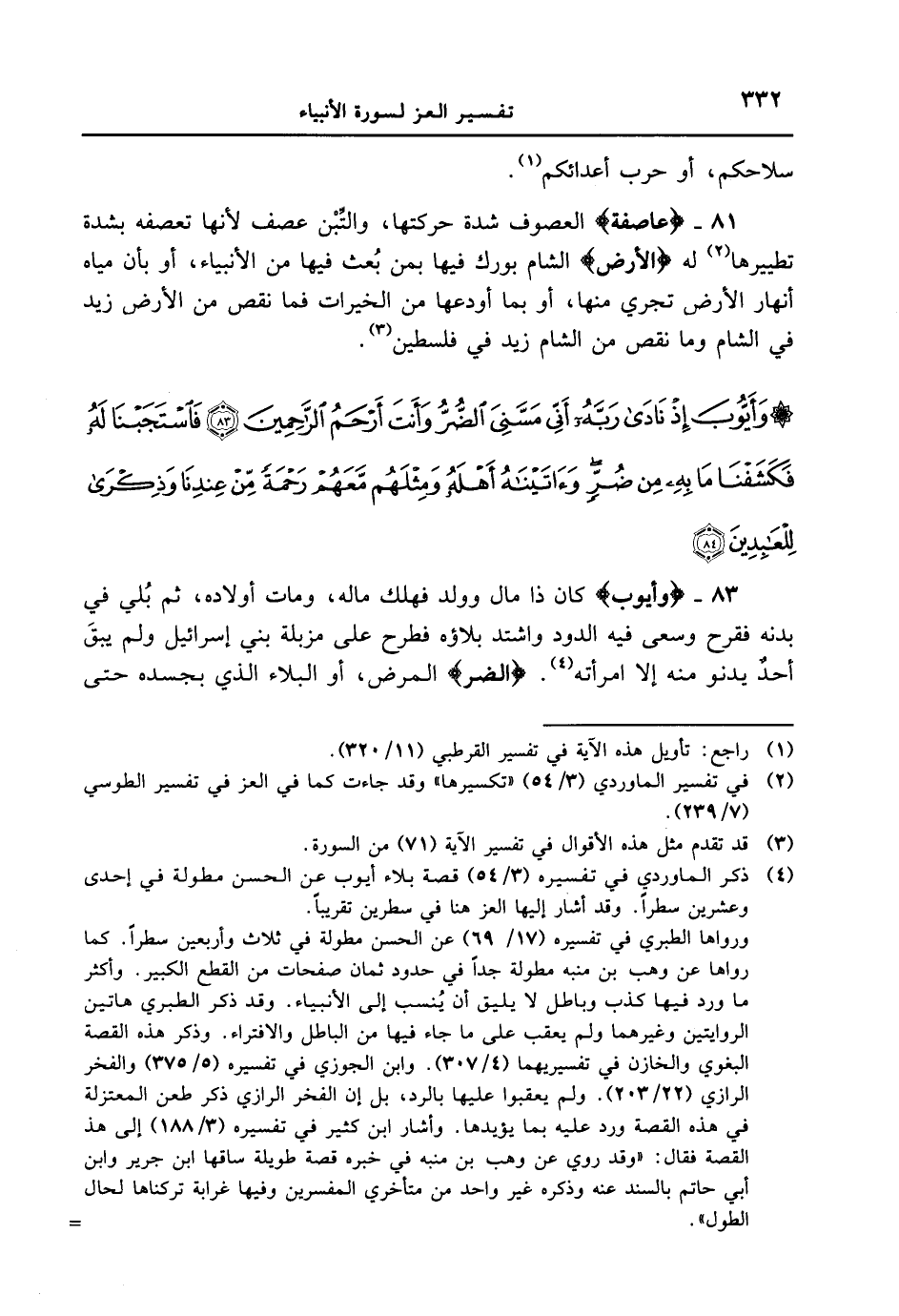 81 - {عَاصِفَةً} العصوف شدة حركتها، والتِّبْن عصف لأنها تعصفه بشدة تطييرها له {الأَرْضِ} الشام بورك فيها بمن بُعث فيها من الأنبياء، أو بأن مياه أنهار الأرض تجري منها، أو بما أودعها من الخيرات فما نقص من الأرض زيد في الشام وما نقص من الشام زيد في فلسطين. {وأيوب إذ نادى ربه أنى مسنى الضر وأنت أرحم الراحمين فاستجبنا له فكشفنا ما به من ضر وءاتيناه أهله ومثلهم معهم رحمة من عندنا وذكرى للعابدين} 83 - {وأيوب} كان ذا مال وولد فهلك ماله، ومات أولاده، ثم بُلي في بدنه فقرح وسعى فيه الدود واشتد بلاؤه فطرح على مزبلة بني إسرائيل ولم يبقَ أحدٌ يدنو منه إلا امرأته. {الضُّرُّ} المرض، أو البلاء الذي بجسده حتى