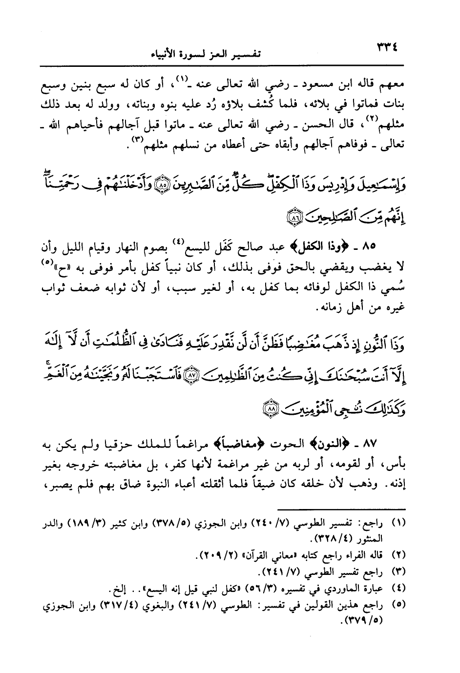 85 - {وَذَا الْكِفْلِ} عبد صالح كَفَل لليسع بصوم النهار وقيام الليل وأن لا يغضب ويقضي بالحق فوفى بذلك، أو كان نبياً كفل بأمر فوفى به " ح " سُمي ذا الكفل لوفائه بما كفل به، أو لغير سبب، أو لأن ثوابه ضعف ثواب غيره من أهل زمانه. {وذا النون إذ ذهب مغاضباً فظن أن لن نقدرعليه فنادى في الظلمات أن لا إله إلا أنت سبحانك إنى كنت من الظالمين فاستجبنا له ونجيناه من الغم وكذالك ننجي المؤمنين}