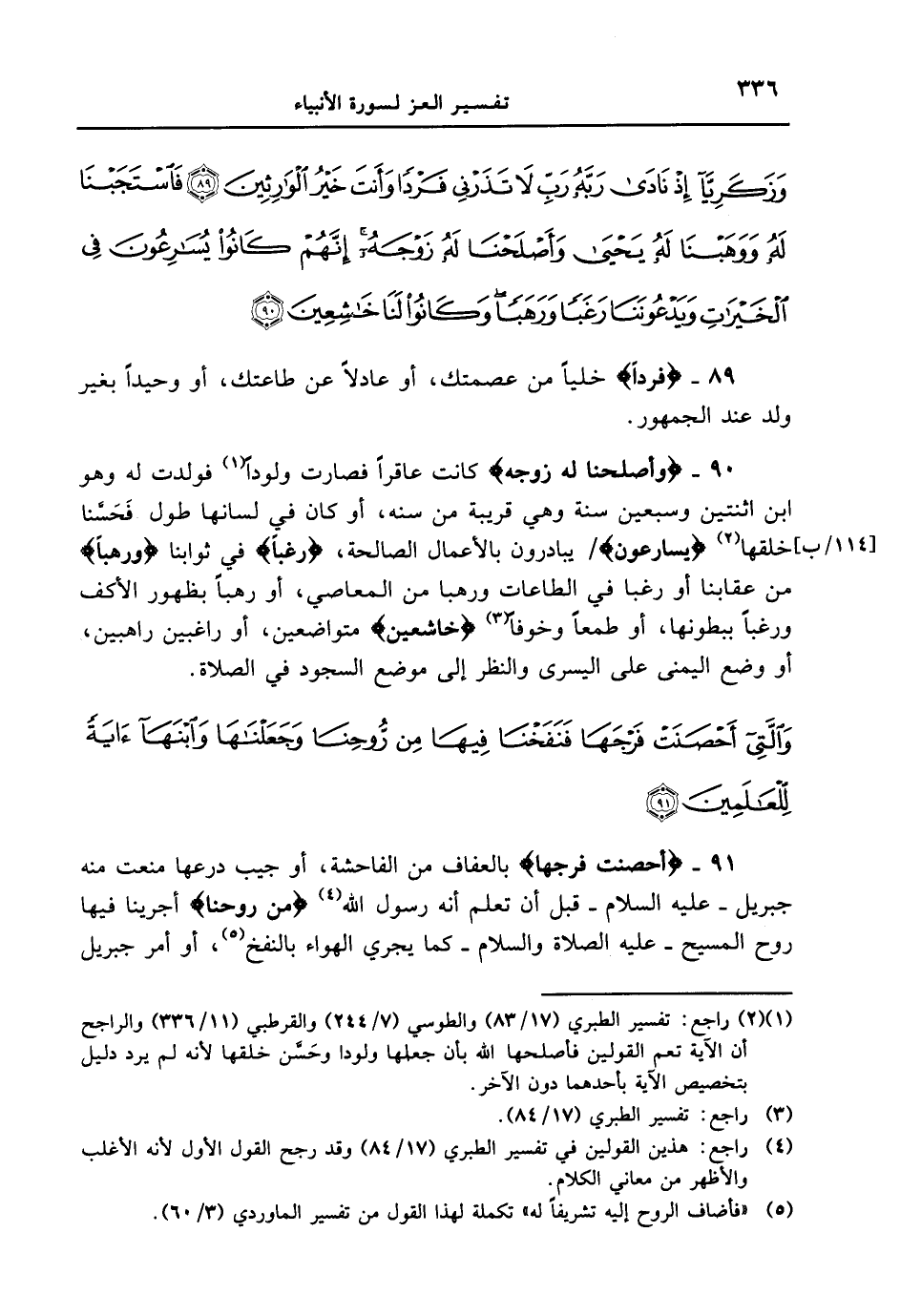 90 - {وَأَصْلَحْنَا لَهُ زَوْجَهُ} كانت عاقراً فصارت ولوداً فولدت له وهو ابن اثنتين وسبعين سنة وهي قريبة من سنه، أو كان في لسانها طول فحسنا خلقها {يسارعون} / [114 / ب] يبادرون بالأعمال الصالحة، {رَغَباً} في ثوابنا {وَرَهَباً} من عقابنا أو رغباً في الطاعات ورهباً من المعاصي، أو رهباً بظهور الأكف ورغباً ببطونها، أو طمعاً وخوفاً {خَاشِعِينَ} متواضعين، أو راغبين راهبين، أو وضع اليمنى على اليسرى والنظر إلى موضع السجود في الصلاة. {والتي أحصنت فرجها فنفخنا فيها من روحنا وجعلناها وابنها ءاية للعالمين}