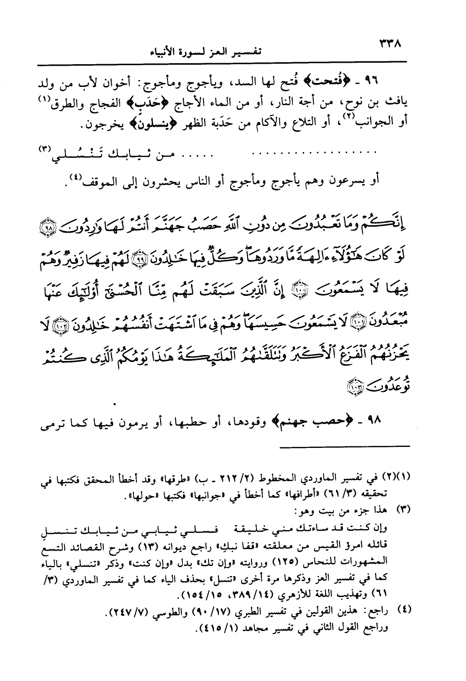 96 - {فُتِحَتْ} فُتح لها السد، ويأجوج ومأجوج: أخوان لأب من ولد يافث بن نوح، من أجة النار، أو من الماء الأجاج {حَدَبٍ} الفجاج والطرق أو الجوانب، أو التلاع والآكام من حَدَبة الظهر {يَنسِلُونَ} يخرجون.