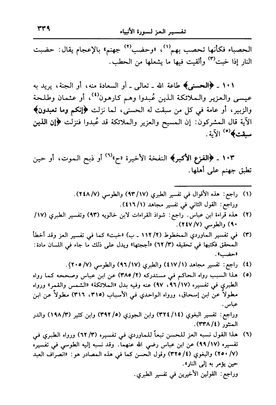 103 - {الْفَزَعُ الأَكْبَرُ} النفخة الأخيرة " ح " أو ذبح الموت، أو حين تطبق جهنم على أهلها.