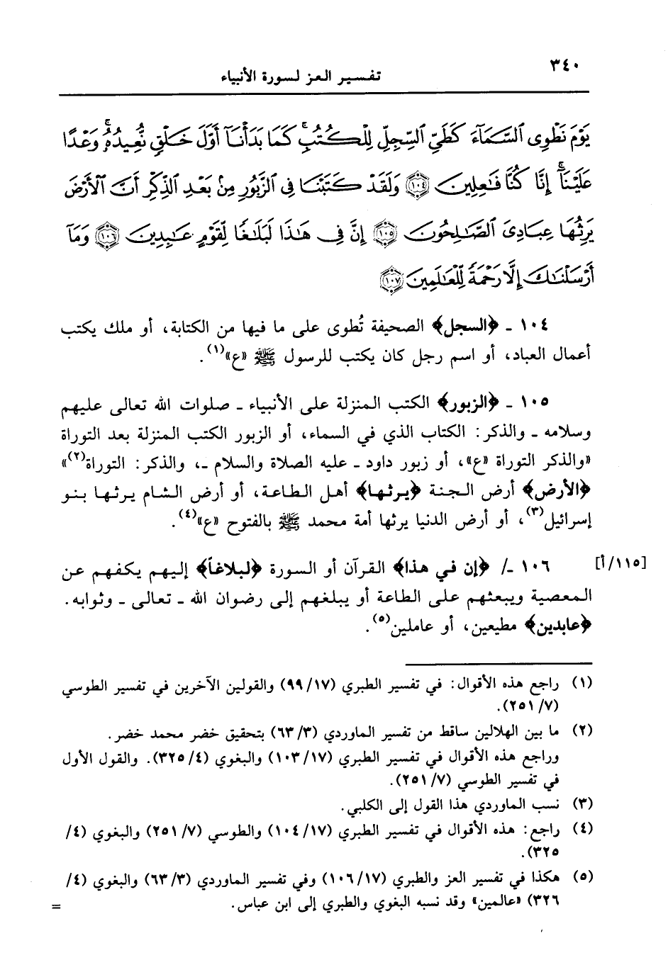 105 - {الزَّبُورِ} الكتب المنزلة على الأنبياء - صلوات الله تعالى عليهم وسلامه - والذكر: الكتاب الذي في السماء، أو الزبور الكتب المنزلة بعد التوراة " والذكر التوراة " ع "، أو زبور داود - عليه الصلاة والسلام -، والذكر: التوراة " {الأَرْضَ} أرض الجنة {يَرِثُهَا} أهل الطاعة، أو أرض الشام يرثها بنو إسرائيل، أو أرض الدنيا يرثها أمه محمد [صلى الله عليه وسلم] بالفتوح " ع ".