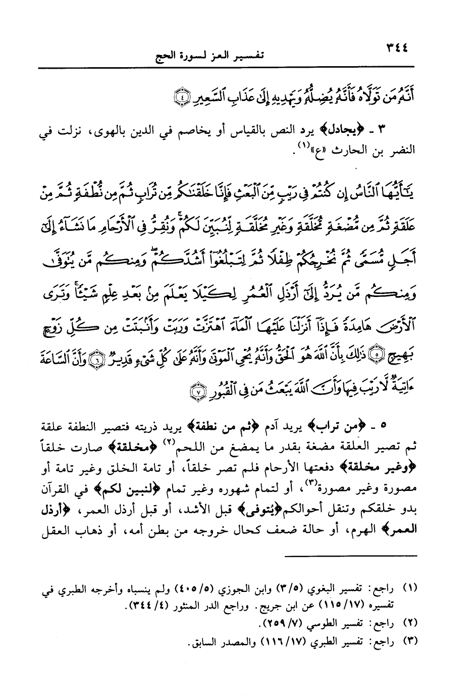 3 - {يُجَادِلُ} يرد النص بالقياس أو يخاصم في الدين بالهوى، نزلت في النضر بن الحارث " ع ". {يا أيها الناس إن كنتم في ريب من البعث فإنّا خلقناكم من ترابٍ ثم من نظفةٍ ثم من علقةٍ ثمّ من مضغةٍ مخلقةٍ وغير مخلقةٍ لنبين لكم ونقرّ في الأرحام ما نشاء إلى أجلٍ مسمى ثم نخرجكم طفلاً ثمّ لتبلغوا أشدّكم ومنكم من يتوفى ومنكم من يردّ إلى أرذل العمر لكيلا يعلم من بعد علمٍ شيئاً وترى الأرض هامدةً فإذا أنزلنا عليها الماء اهتزت وربت وأنبتت من كل زوجٍ بهيج ذلك بأن الله هو الحق وأنّه يحى الموتى وأنّه على كل شىءٍ قديرً وأنّ الساعة ءاتيةٌ لا ريب فيها وأن الله يبعث من في القبور}