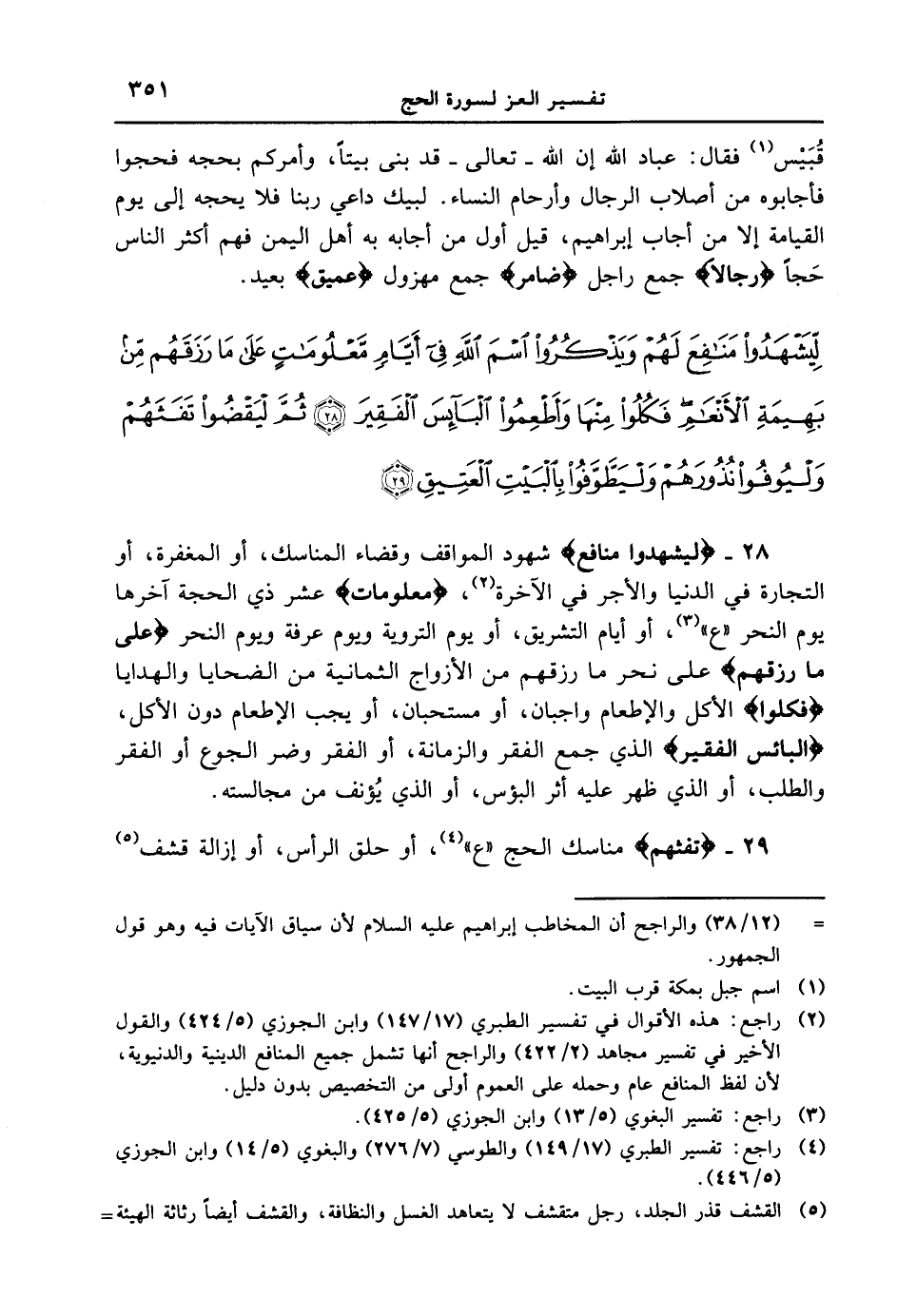 28 - {لِّيَشْهَدُواْ مَنَافِعَ} شهود المواقف وقضاء المناسك، أو المغفرة، أو التجارة في الدنيا والأجر في الآخرة، {مَّعْلُومَاتٍ} عشر ذي الحجة أخرها يوم النحر " ع "، أو أيام التشريق، أو يوم التروية ويوم عرفة ويوم النحر {عَلَى مَا رَزَقَهُم} على نحر ما رزقهم من الأزواج الثمانية من الضحايا والهدايا {فَكُلُواْ} الأكل والإطعام واجبان، أو مستحبان، أو يجب الإطعام دون الأكل، {الْبَآئِسَ الْفَقِيرَ} الذي جمع الفقر والزمانة، أو الفقر وضر الجوع أو الفقر والطلب، أو الذي ظهر عليه أثر البؤس، أو الذي يُؤنف من مجالسته.
