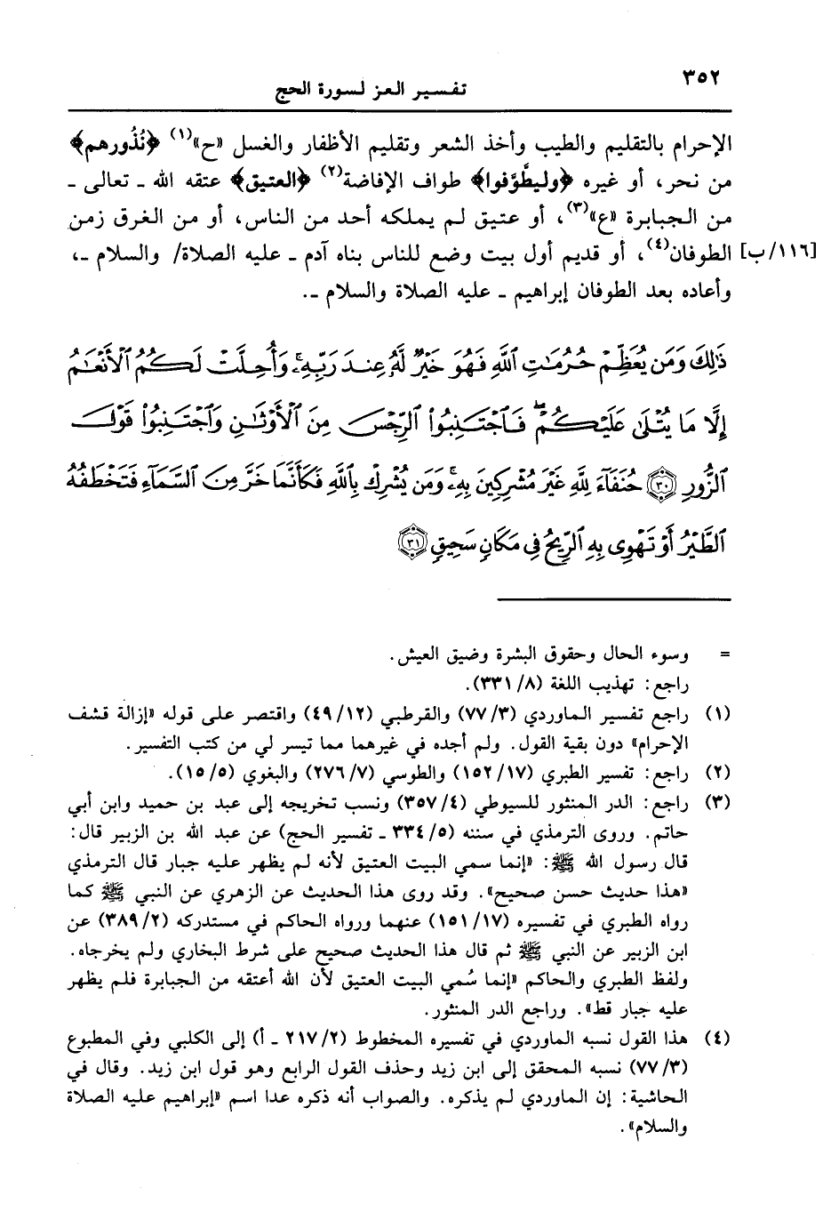 الإحرام بالتقليم والطيب وأخذ الشعر وتقليم الأظفار والغسل " ح " {نُذُورَهُمْ} من نحر، أو غيره {وَلْيَطَّوَّفُواْ} طواف الإفاضة {الْعَتِيقِ} عتقه الله - تعالى - من الجبابرة " ع "، أو عتيق لم يملكه أحد من الناس، أو من الغرق زمن الطوفان، أو قديم أول بيت وضع للناس بناه آدم - عليه الصلاة / والسلام -، وأعاده بعد الطوفان إبراهيم - عليه الصلاة والسلام -. {ذلك ومن يعظّم الله فهو خيرٌ له عند ربّه وأحلّت لكم الأنعام إلا ما يتلى عليكم فاجتنبوا الرّجس من الأوثان واجتنبوا قول الزور حنفاء لله غير مشركين به ومن يشرك بالله فكأنما خرّ من السماء فتخطفه الطير أو تهوى به الريح في مكان سحيقٍ}