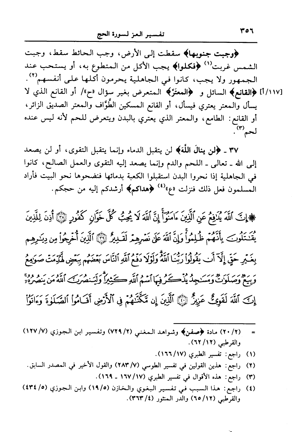 37 - {لَن يَنَالَ اللَّهَ} لن يتقبل الدماء وإنما يتقبل التقوى، أو لن يصعد إلى الله - تعالى - اللحم والدم وإنما يصعد إليه التقوى والعمل الصالح، كانوا في الجاهلية إذا نحروا البدن استقبلوا الكعبة بدمائها فنضحوها نحو البيت فأراد المسلمون فعل ذلك فنزلت " ع " {هَدَاكُمْ} أرشدكم إليه من حجكم. {إنّ الله يدافع عن الذين ءامنوا إن الله لا يحبّ كل خوانٍ كفورٍ إذن للذين يقاتلون بأنهّم ظلموا وإن الله على نصرهم لقدير الذين أخرجوا من ديارهم بغير حق إلا أن يقولوا ربّنا الله ولولا دفع الله الناس بعضهم ببعض لهدمت صوامع وبيعٌ وصلوات ومساجد يذكر فيها اسم الله كثيراً ولينصرن الله من ينصره إن الله لقوى عزيزٌ الذين إن مكنّاهم في الأرض أقاموا الصلاة وءاتوا