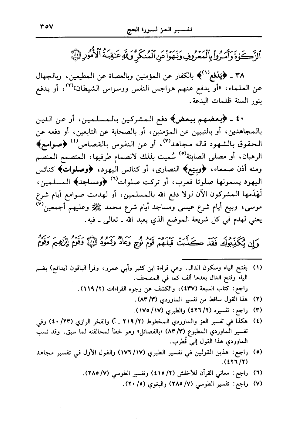 40 - {بَعْضَهُم بِبَعْضٍ} دفع المشركين بالمسلمين، أو عن الدين بالمجاهدين، أو بالنبيين عن المؤمنين، أو بالصحابة عن التابعين، أو دفعه عن الحقوق بالشهود قاله مجاهد، أو عن النفوس بالقصاص {صَوَامِعُ} الرهبان، أو مصلى الصابئة سُميت بذلك لانصمام طرفيها، المتصمع المنصم ومنه أذن صمعاء، {وَبِيَعٌ} النصارى، أو كنائس اليهود، {وَصَلَوَاتٌ} كنائس اليهود يسمونها صلوتاً فعرب، أو تركت صلوات {وَمَسَاجِدُ} المسلمين، لَهَدَمها المشركون الآن لولا دفع الله بالمسلمين، أو لهدمت صوامع أيام شرع موسى، وبيع أيام شرع عيسى ومساجد أيام شرع محمد [صلى الله عليه وسلم] وعليهم أجمعين يعني لهدم في كل شريعة الموضع الذي يعبد الله - فيه. {وإن يكذبوك فقد كذبت قبلهم قوم نوحٍ وعادٌ وثمود وقوم إبراهيم وقوم