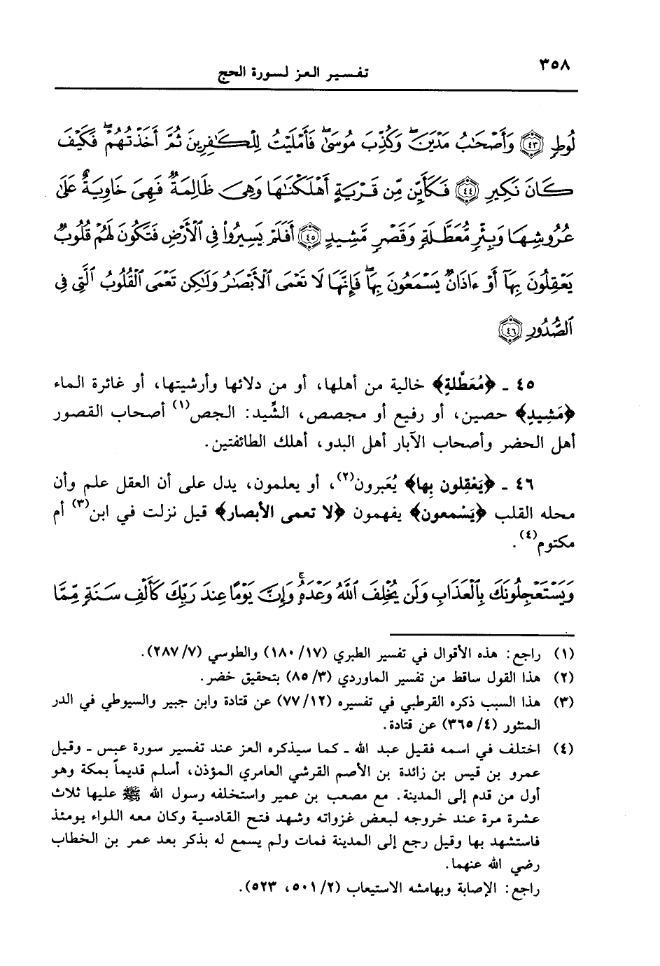 45 - {مُّعَطَّلَةٍ} خالية من أهلها، أو من دلائها وأرشيتها، أو غائرة الماء {مَّشِيدٍ} حصين، أو رفيع أو مجصص، الشِّيد: الجص أصحاب القصور أهل الحضر وأصحاب الآبار أهل البدو، أهلك الطائفتين.