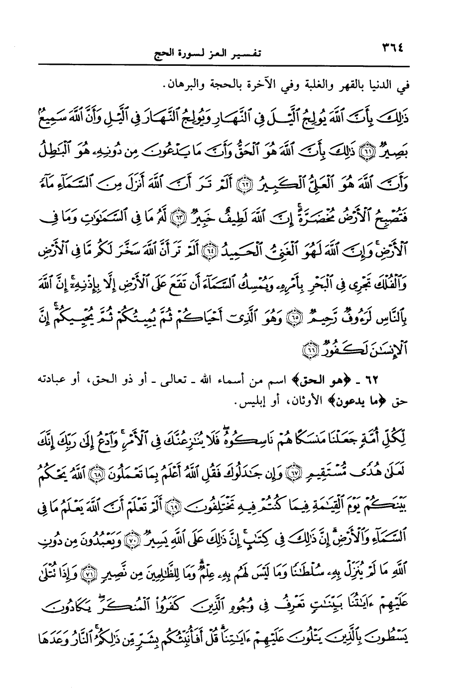في الدنيا بالقهر والغلبة وفي الآخرة بالحجة والبرهان. {ذلك بأن الله يولج الّيل في النهار ويولج النهار في الّيل وأن الله سميع بصيرٌ ذلك بأنّ الله هو الحق وأن ما يدعون من دونه هو الباطل وأنّ الله هو العلي الكبير ألم تر أن الله أنزل من السماء ماءً فتصبح الأرض مخضرة إنّ الله لطيف خبيرٌ له ما في السموات وما في الأرض وإنّ الله لهو الغني الحميد ألم تر أن الله سخر لكم ما في الأرض والفلك تجري في البحر بأمره ويمسك السماء أن تقع على الأرض إلا بإذنه إن الله بالناس لرءوف رحيم وهو الذي أحياكم ثم يميتكم ثم يحييكم إن الإنسان لكفورٌ}