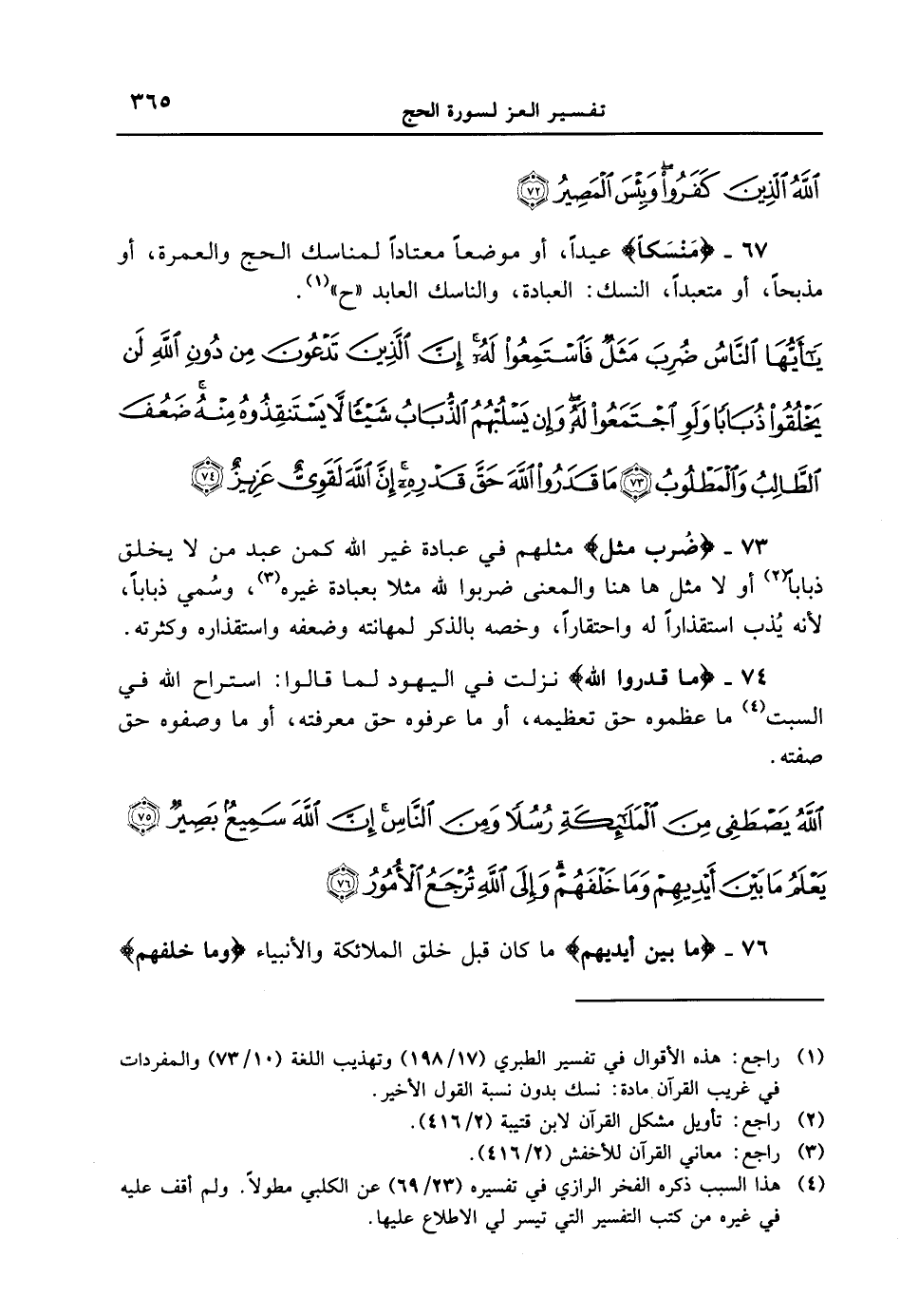 67 - {مَنسَكاً} عيداً، أو موضعاً معتاداً لمناسك الحج والعمرة، أو مذبحاً، أو متعبداً، النسك: العبادة، والناسك العابد " ح ". {يا أيها الناس ضرب مثل فاستمعوا له إن الذين تدعون من الله لن يخلقوا ذباباً ولو اجتمعوا له وإن يسلبهم الذباب شيئاً لا يستنقذوه منه ضعف الطالب والمطلوب ما قدروا الله حق قدره إن الله لقويٌ عزيزٌ}