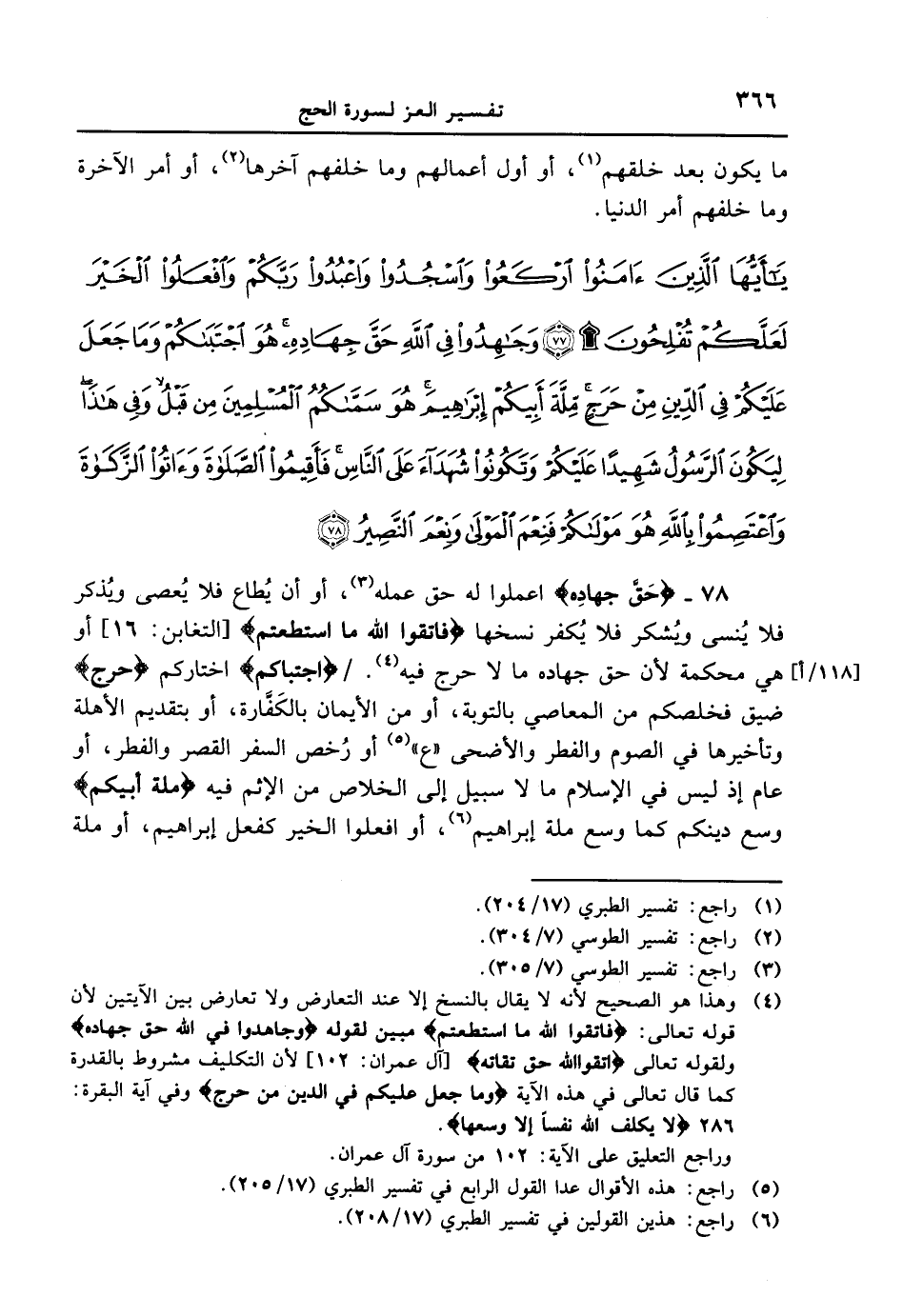 78 - {حَقَّ جِهَادِهِ} اعملوا له حق عمله، أو أن يُطاع فلا يُعصى ويُذكر فلا يُنسى ويُشكر فلا يُكفر نسخها {فاتقوا الله مَا استطعتم} [التغابن: 16] أو هي محكمة لأن حق جهاده ما لا حرج فيه. / [118 / أ] {اجْتَبَاكُمْ} اختاركم {حَرَجٍ} ضيق فخلصكم من المعاصي بالتوبة، أو من الأيمان بالكَفَّارة، أو بتقديم الأهلة وتأخيرها في الصوم والفطر والأضحى " ع " أو رُخص السفر القصر والفطر، أو عام إذ ليس في الإسلام ما لا سبيل إلى الخلاص من الإثم فيه {مِّلَّة أَبِيكُمْ} وسع دينكم كما وسع ملة إبراهيم، أو افعلوا الخير كفعل إبراهيم، أو ملة