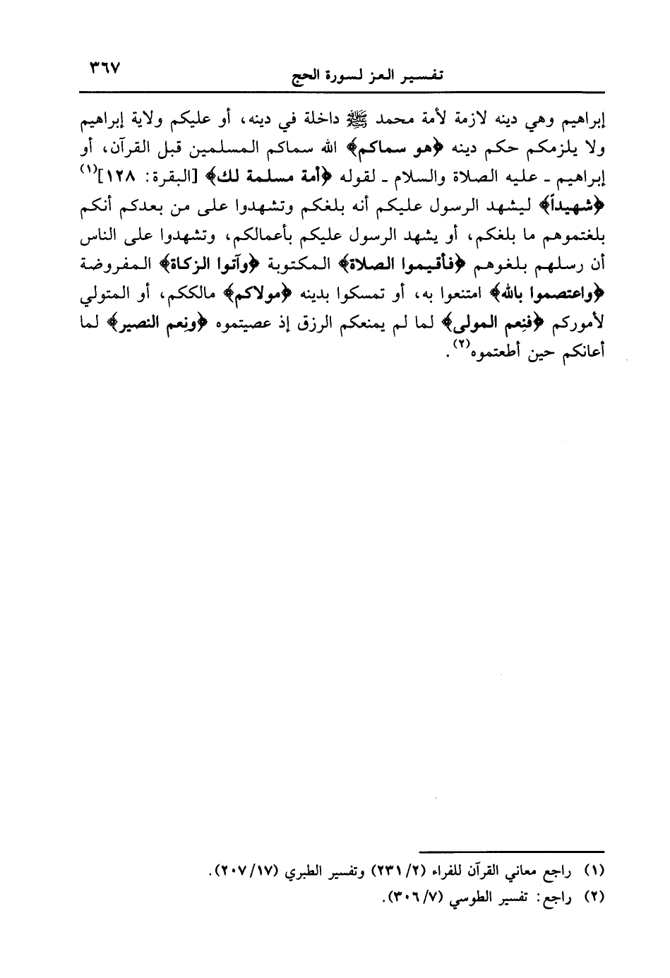 إبراهيم وهي دينه لازمة لأمة محمد [صلى الله عليه وسلم] داخلة في دينه، أو عليكم ولاية إبراهيم ولا يلزمكم حكم دينه {هُوَ سَمَّاكُمُ} الله سماكم المسلمين قبل القرآن، أو إبراهيم - عليه الصلاة والسلام - لقوله {أُمَّةً مُّسْلِمَةً لَّكَ} [البقرة: 128] {شَهِيداً} ليشهد الرسول عليكم أنه بلغكم وتشهدوا على بعدكم أنكم بلغتموهم ما بلغكم، أو يشهد الرسول عليكم بأعمالكم، وتشهدوا على الناس أن رسلهم بلغوهم {فأقيموا الصلاة} المكتوبة {وآتوا الزَّكَاةَ} المفروضة {وَاعْتَصِمُواْ بِاللَّهِ} امتنعوا به، أو تمسكوا بدينه {مَوْلاكُمْ} مالككم، أو المتولي لأموركم {فَنِعْمَ الْمَوْلَى} لما لم يمنعكم الرزق إذ عصيتموه {ونعم النصير} لما أعانكم حين أطعمتوه.