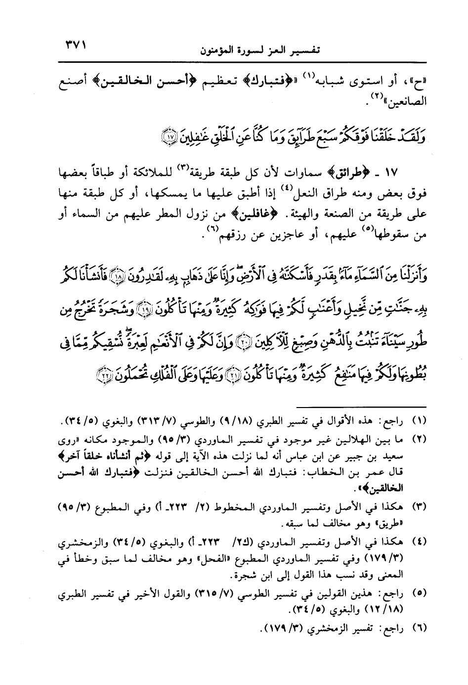 " ح "، أو استوى شبابه " {فَتَبَارَكَ} تعظيم {أَحْسَنُ الخالقين} أصنع الصانعين ". {ولقد خلقنا فوقكم سبع طرائق وما كنا عن الخلق غافلين} \ 17 - {طَرَآئِقَ} سماوات لأن كل طبقة طريقة للملائكة أو طباقاً بعضها فوق بعض ومنه طراق النعل إذا أطبق عليها ما يمسكها، أو كل طبقة منها على طريقة من الصنعة والهيئة. {غَافِلِينَ} من نزول المطر عليهم من السماء أو من سقوطها عليهم، أو عاجزين عن رزقهم. {وأنزلنا من السماء ماء بقدر فأسكناه في الأرض وإنا على ذهاب به لقادرون فأنشأنا لكم به جنات من نخيل وأعناب لكم فيها فواكه كثيرة ومنها تأكلون وشجرة تخرج من طور سيناء تنبت بالدهن وصبغ للآكلين وإن لكم في الأنعام لعبرة نسقيكم مما في بطونها ولكم فيها منافع كثيرة ومنها تأكلون وعليها وعلى الفلك تحملون}