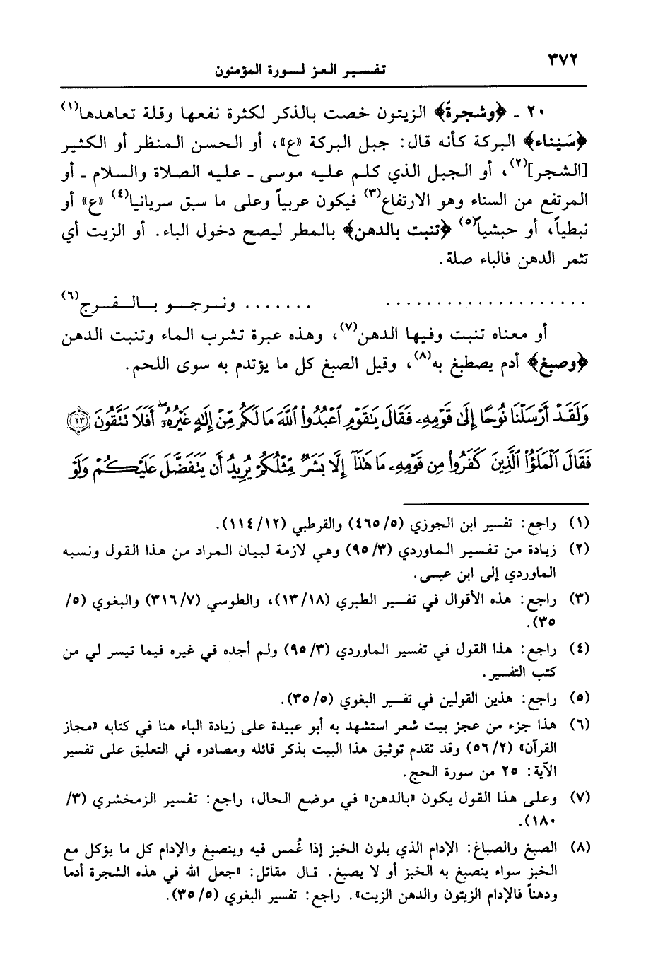 20 - {وَشَجَرَةً} الزيتون خصت بالذكر لكثرة نفعها وقلة تعاهدها {سَيْنَآءَ} البركة كأنه قال: جبل البركة " ع "، أو الحسن المنظر أو الكثير [الشجر] ، أو الجبل الذي كلم عليه موسى - عليه الصلاة والسلام - أو المرتفع من السناء وهو الارتفاع فيكون عربياً وعلى ما سبق سريانياً " ع " أو نبطياً، أو حبشياً {تَنبُتُ بِالدُّهْنِ} بالمطر ليصح دخول الباء. أو الزيت أي تثمر الدهن فالباء صلة.