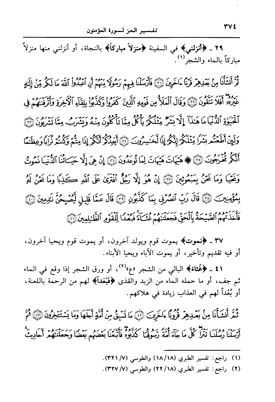 29 - {أَنزِلْنِى} في السفينة {مُنزَلاً مُّبَارَكاً} بالنجاة، أو أنزلني منها منزلاً مباركاً بالماء والشجر. {ثم أنشأنا من بعدهم قرناً ءاخرين فأرسلنا فيهم رسولاً منهم أن اعبدوا الله ما لكم من إله غيره أفلا تتّقون وقال الملأ من قومه الذين كفروا وكذبوا بلقاء الأخرة وأترفناهم في الحياة الدنيا ما هذا إلا بشرٌ مثلكم يأكل مما تأكلون منه ويشرب ممّا تشربون ولئن أطعتم بشراٌ مثلكم إنّكم إذا لخاسرون أيعدكم إنّكم إذا متم وكنتم تراباً وعظاماً أنّكم مخرجون هيهات هيهات لما توعدون إن هي إلا حياتنا الدّنيا نموت ونحيا وما نحن بمبعوثين إن هو إلا رجل افترى على الله كذباً وما نحن له بمؤمنين قال ربّ انصرني بما كذّبون 39 قال عمّا قليل ليصبحن نادمين فأخذتهم الصّيحة بالحق فجعلناهم غثاءً فبعداً للقوم الظالمين}