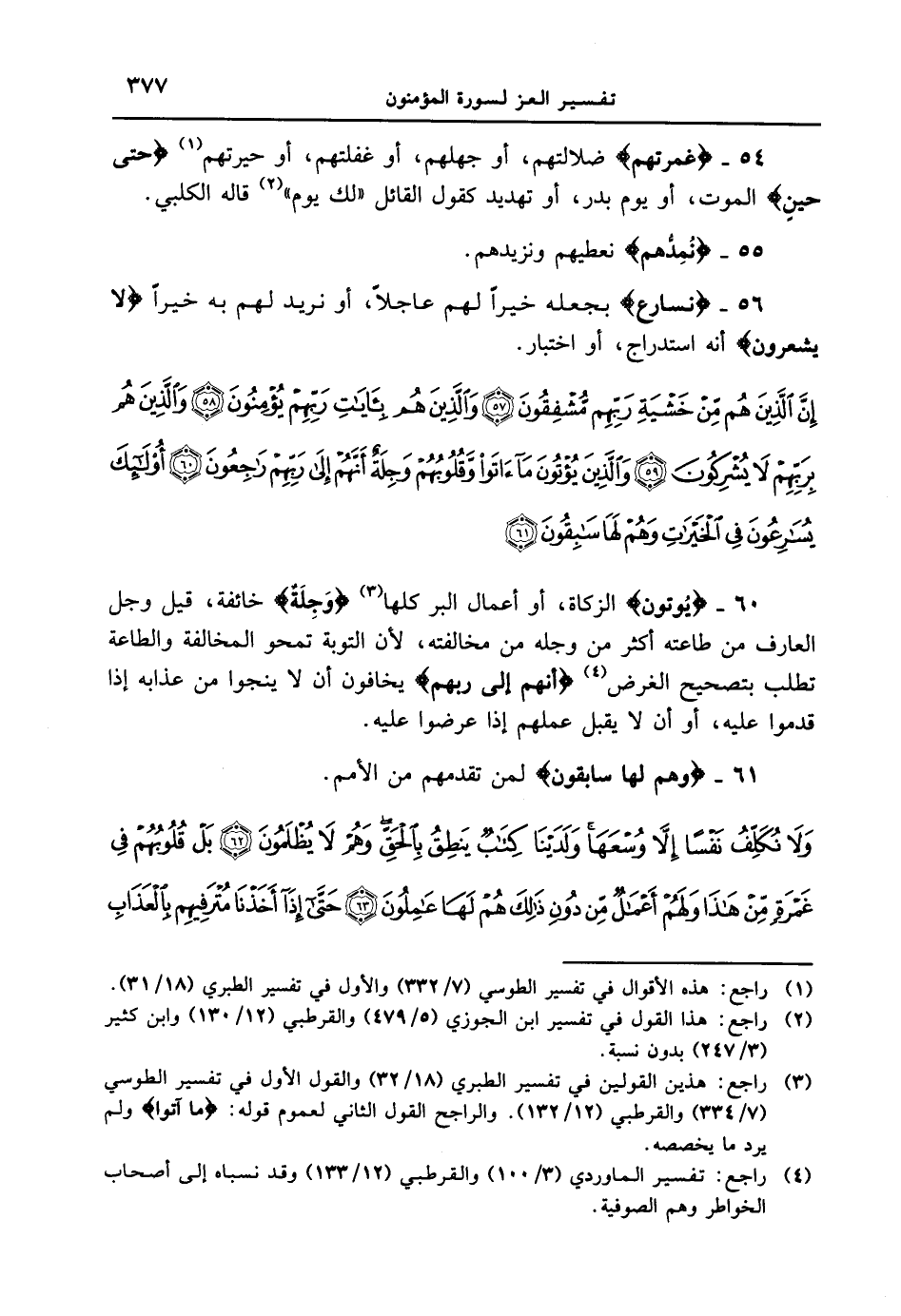 61 - {وَهُمْ لَهَا سَابِقُونَ} لمن تقدمهم من الأمم. {ولا نكلّف نفساً إلا وسعها ولدينا كتابٌ ينطق بالحق وهم لا يظلمون بل قلوبهم في غمرةٍ من هذا ولهم أعمال من دون ذلك هم لها عاملون 63 حتى إذا أخذنا مترفيهم بالعذاب
