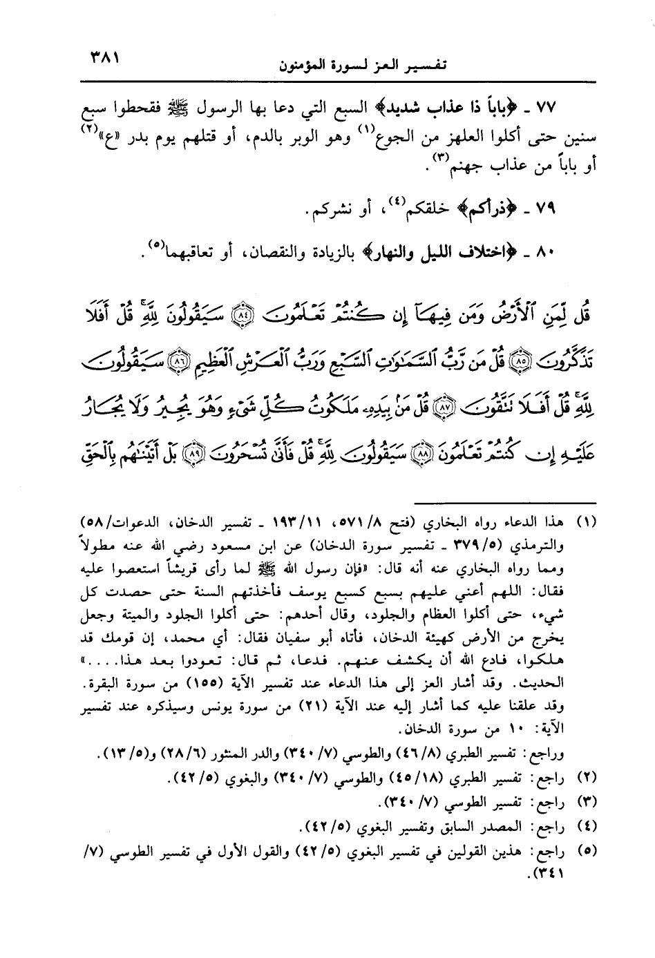 80 - {اختلاف الليل والنهار} بالزيادة والنقصان، أو تعاقبهما. {قل لمن الأرض ومن فيها إن كنتم تعلمون سيقولون لله قل أفلا تذكرون قل من ربّ السموات السبّع وربّ العرش العظيم سيقولون لله قل أفلا تتقون 5 قل من بيده ملكوت كل شىءٍ وهو يجير ولا يجار عليه إن كنتم تعلمون سيقولون لله قل فأنى تسحرون 89 بل أتيناهم بالحق
